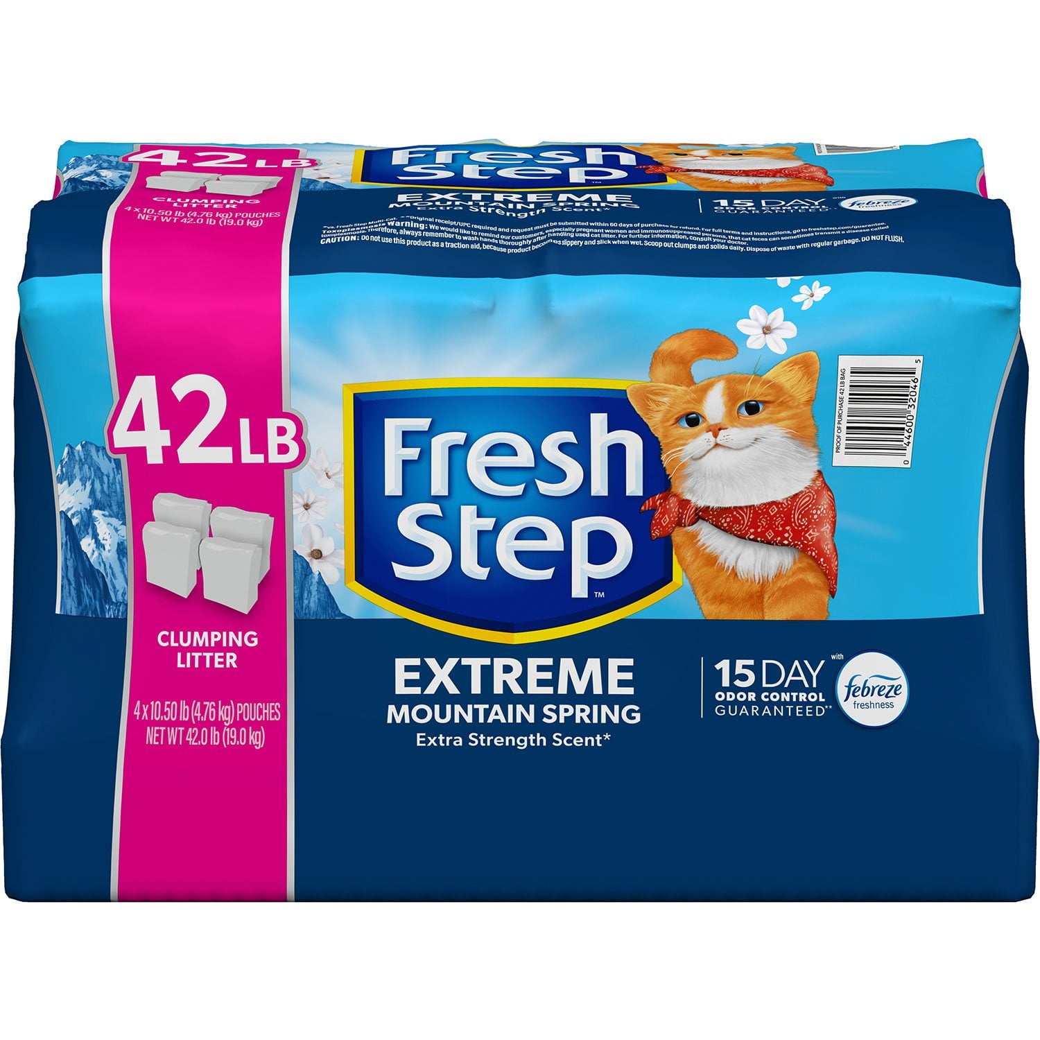 • Fresh Step Cat Litter Extreme Mountain Spring with Febreze freshness has an extra-strength scent that keeps your cat’s litter box smelling clean and inviting