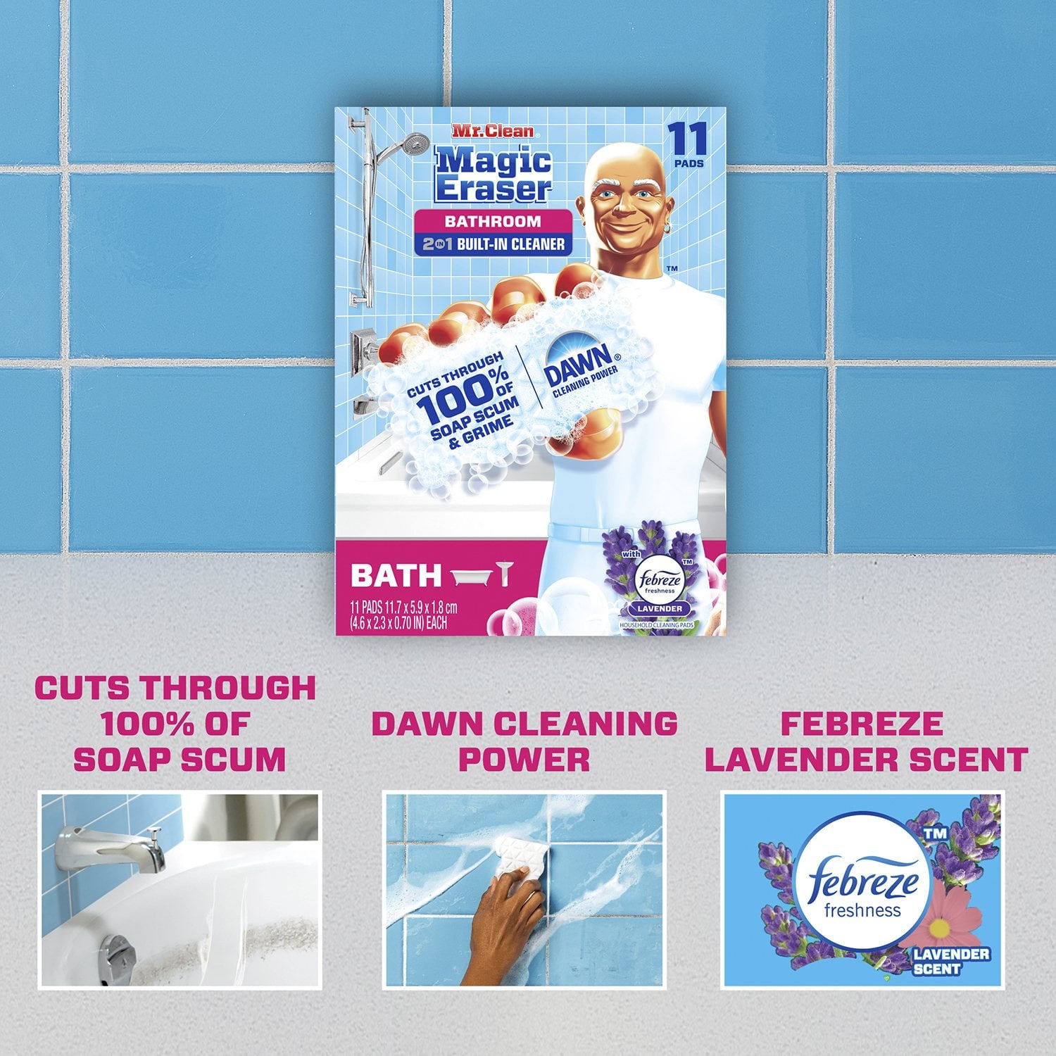 | Claims and Certifications | Contains Lavender Scent and Dawn Cleaning Power. Removes mold, mildew, and 100% of soap scum. The Scrubbing Power of Mr. Clean Magic Eraser |