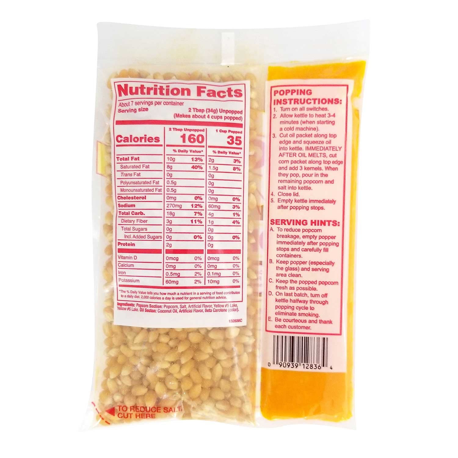 Includes: 36 kits per case, 6 oz. corn, coconut oil/high oleic canola oil, and salt kit. Makes up to 120 quarts of popped corn