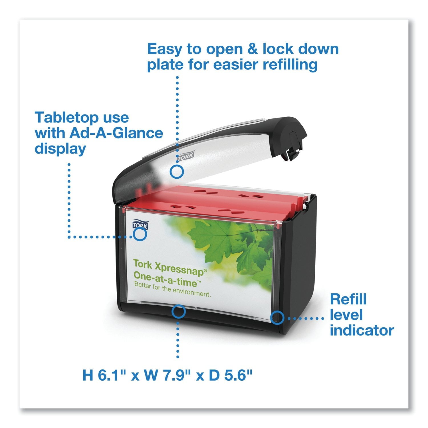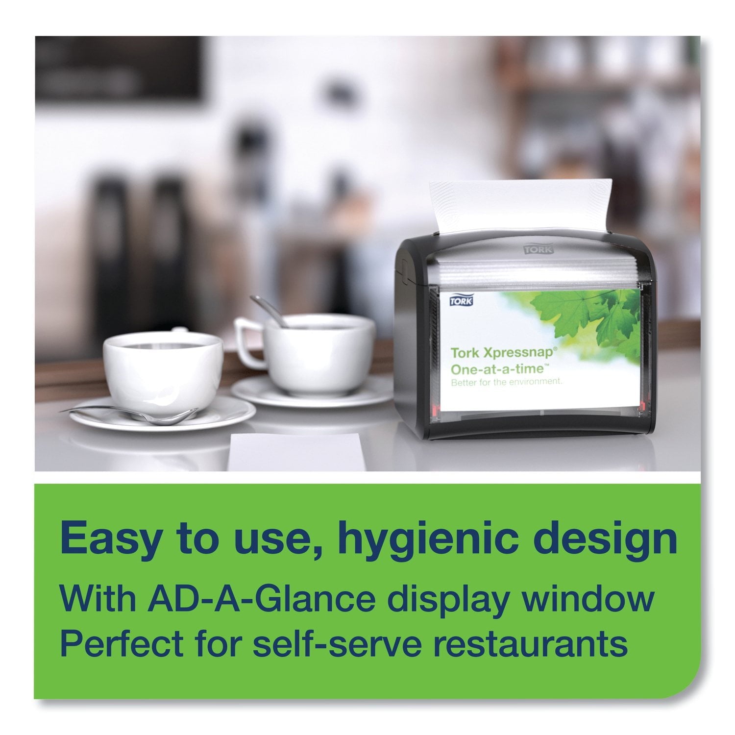 The Tork Xpressnap Tabletop Napkin Dispenser is ideal for high-traffic, limited-service restaurants. This top-rated system improves efficiency with a one-at-a-time dispensing mechanism, reducing napkin consumption by 25%. The dispenser's fully covered design protects napkins from contamination, while the level indicator ensures 100% napkin availability during peak times.
