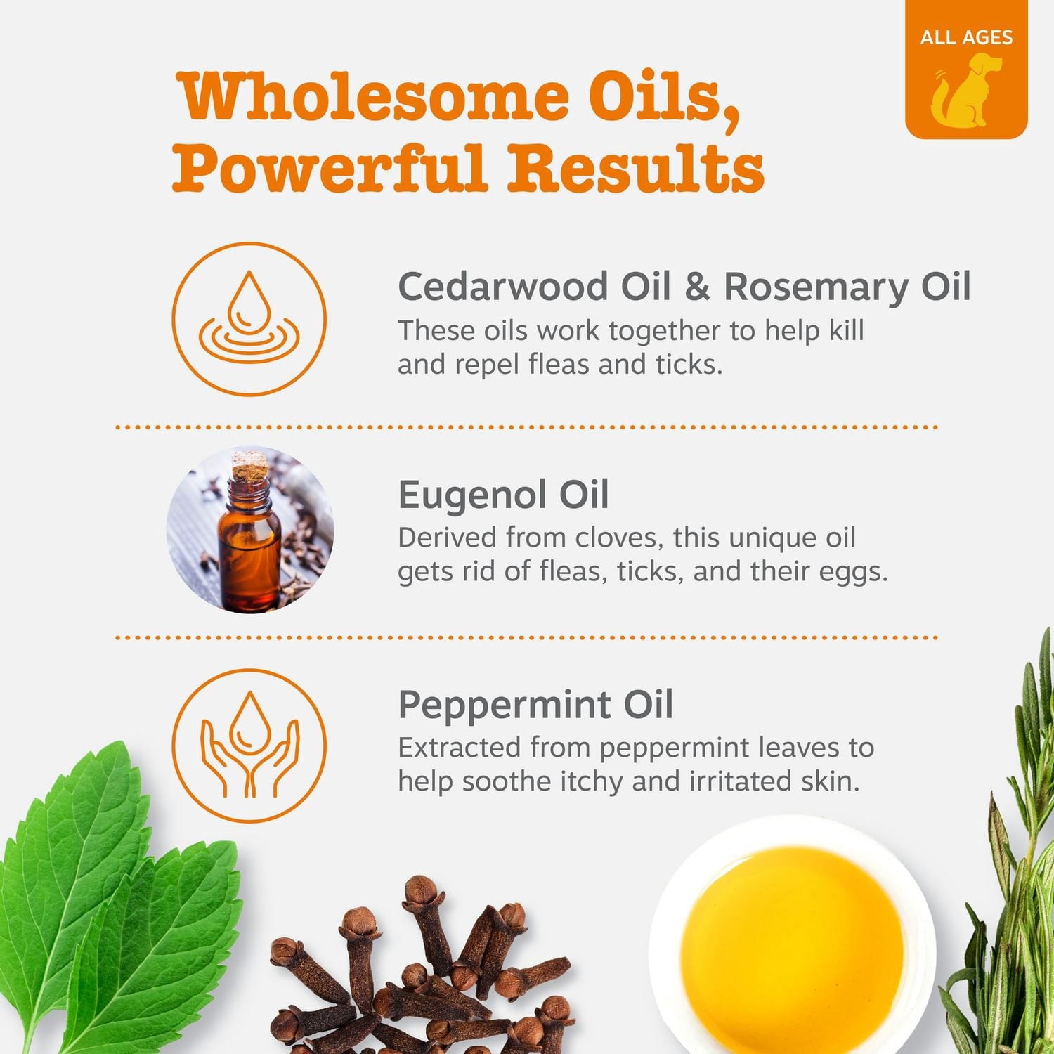 • Plant-based oils, including cedarwood and rosemary, help repel fleas and ticks