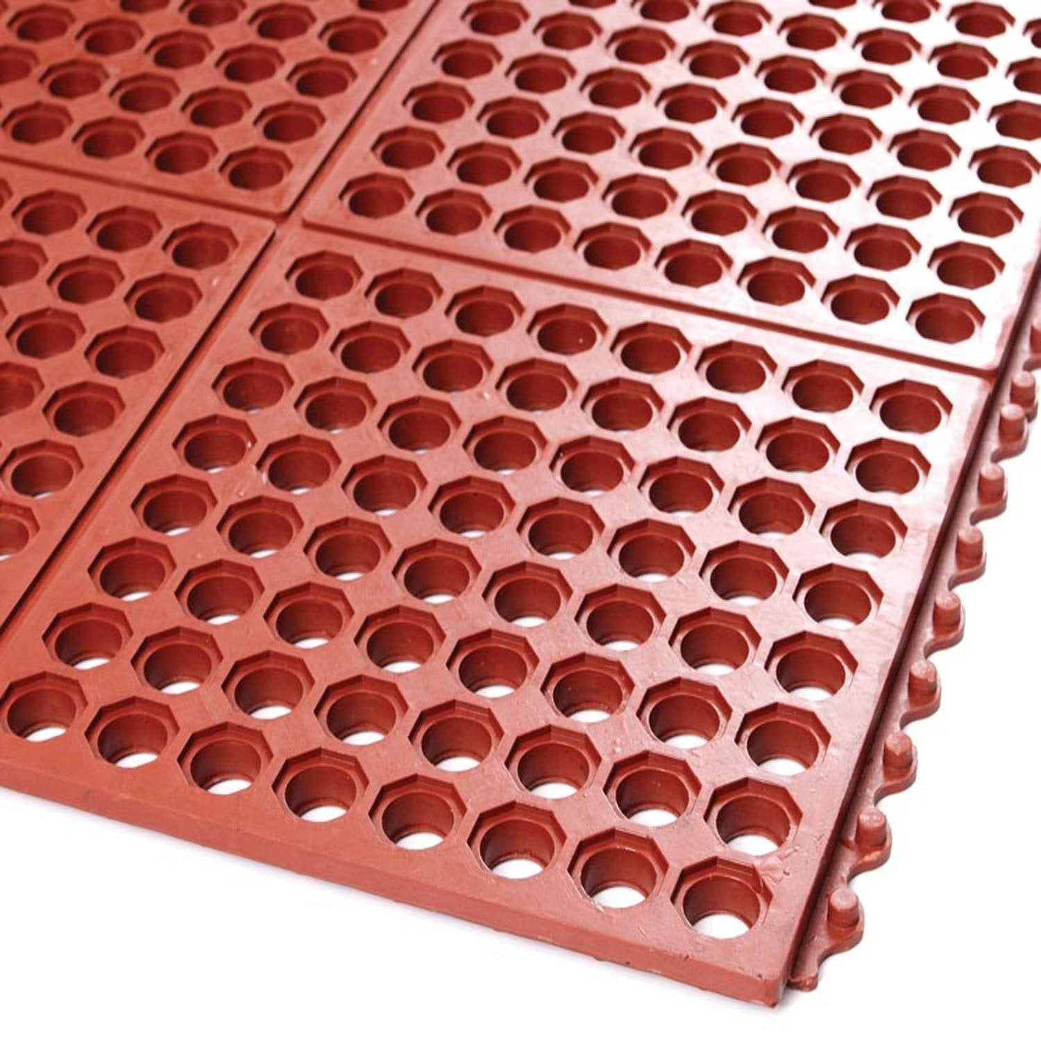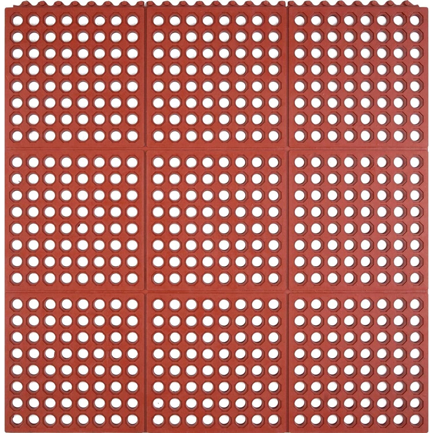 The modular cell design of this kitchen floor mat allows liquids to easily flow through it. It features a nib backing that elevates it above the surface for improved drainage of oils and grease. This rubber kitchen mat has one side with built-in, interlocking connectors to join multiple pieces securely together, letting you quickly create a larger unit to fit a wider space.
