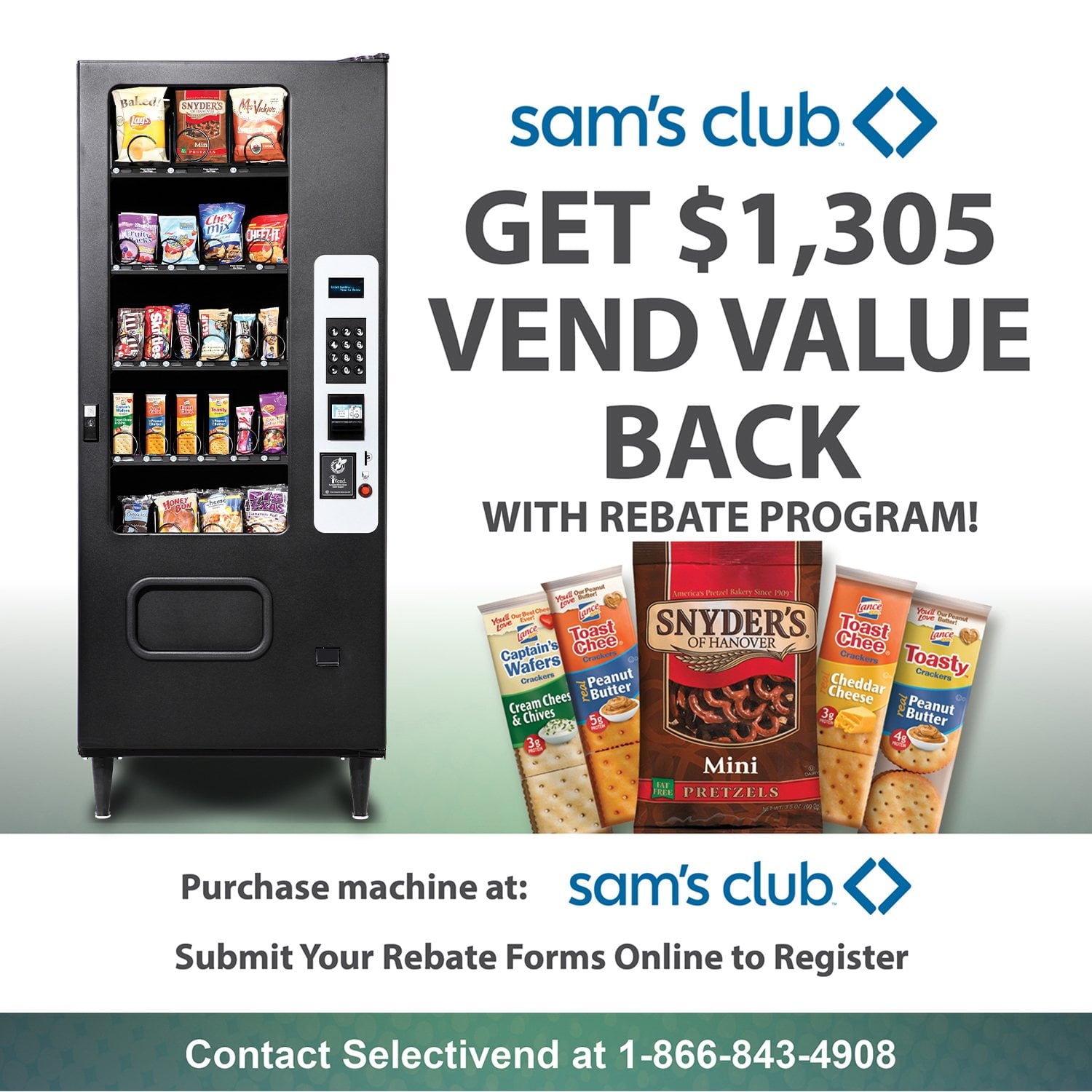 Selectivend SV3000 Vending Machine begins a business by investing in a single machine that plugs into one 110 VAC grounded outlet and can be loaded with your favorite snack products. Set your vending machine prices and be sure your profit is counted accurately with programmable individual item pricing and reliance on a premium electronic coin changer and bill accepter. Save a little more money with automatic, programmable shutdown modes at specific times. Additionally, when you purchase with Sam's Club, become eligible for a limited time offer rebate valued at more than $1,500 in vend value.