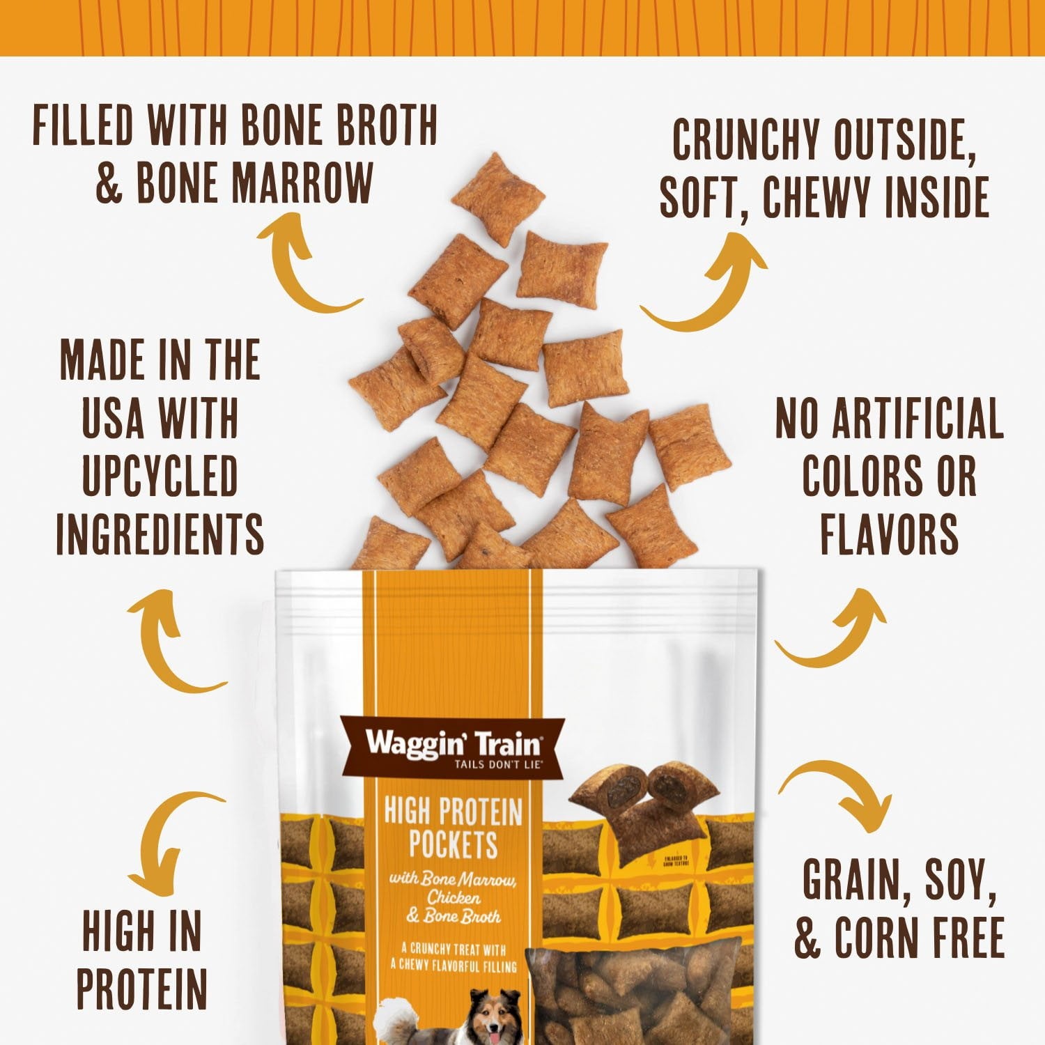 Those tails will start waggin' when you crack open a bag! Waggin' Train High Protein Pockets are a crunchy treat with a chewy, flavorful filling. A delictable, crunchy chicken outside envelops a soft, chewy bone marrow & bone broth filled center - your pup won't be able to get enough! Made in the USA with globally sourced & upcycled ingredients, High Protein Pockets are a guilt-free, indulgent snack that your dogs love getting and you love giving. Plus, High Protein Pockets are never made with any wheat, corn, soy, or artificial ingredients or preservatives, so you can feel good about pampering your pet. Get those tails waggin'!