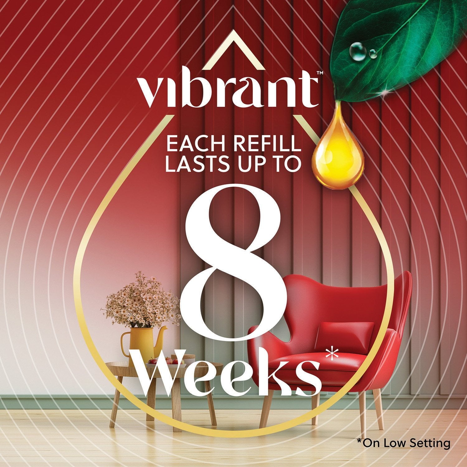 Each refill lasts up to 45 days* on the low setting, providing continuous fragrance without the need for water. The diffuser features adjustable frequency settings and begins with a 2X initial fragrance boost to fill the room. It operates on an 8-hour cycle, releasing mist regularly, followed by a 16-hour standby mode.