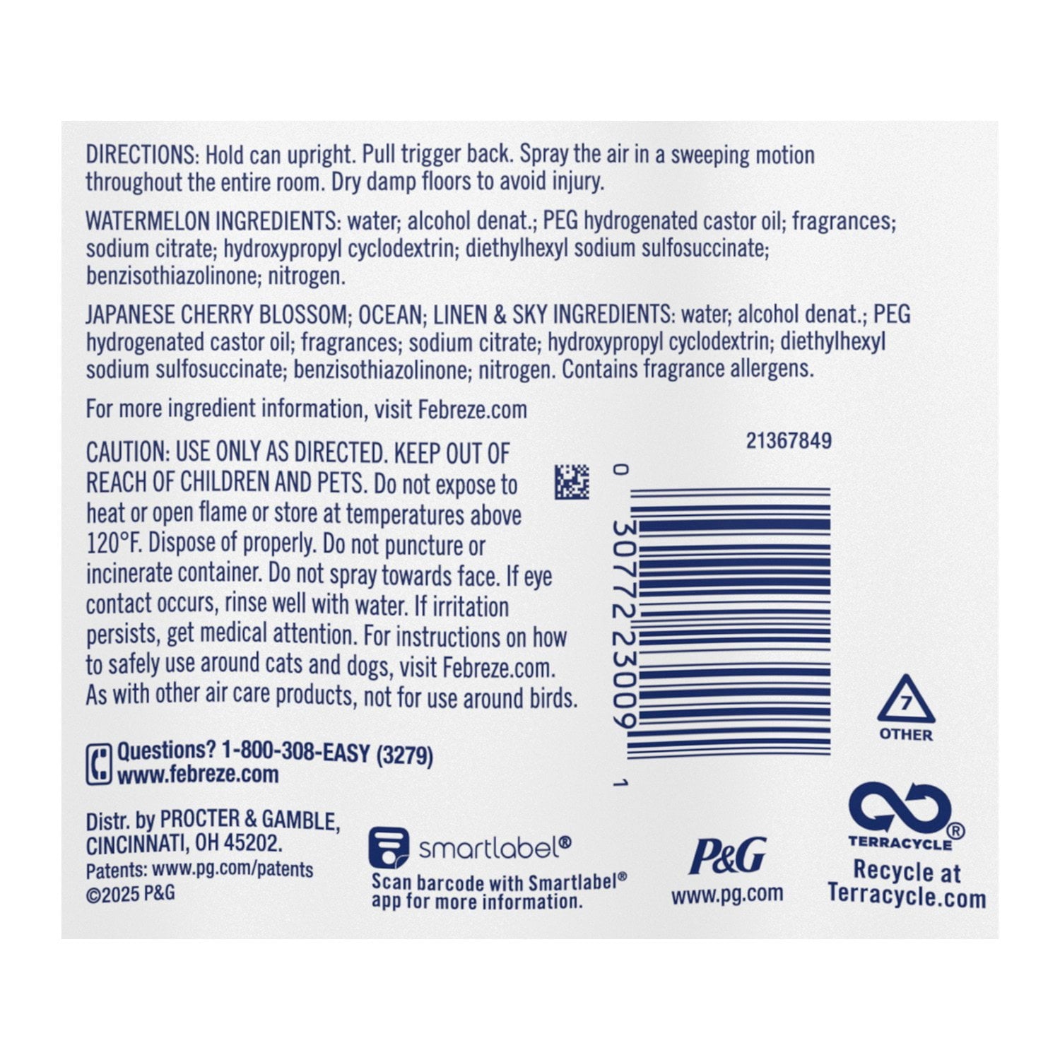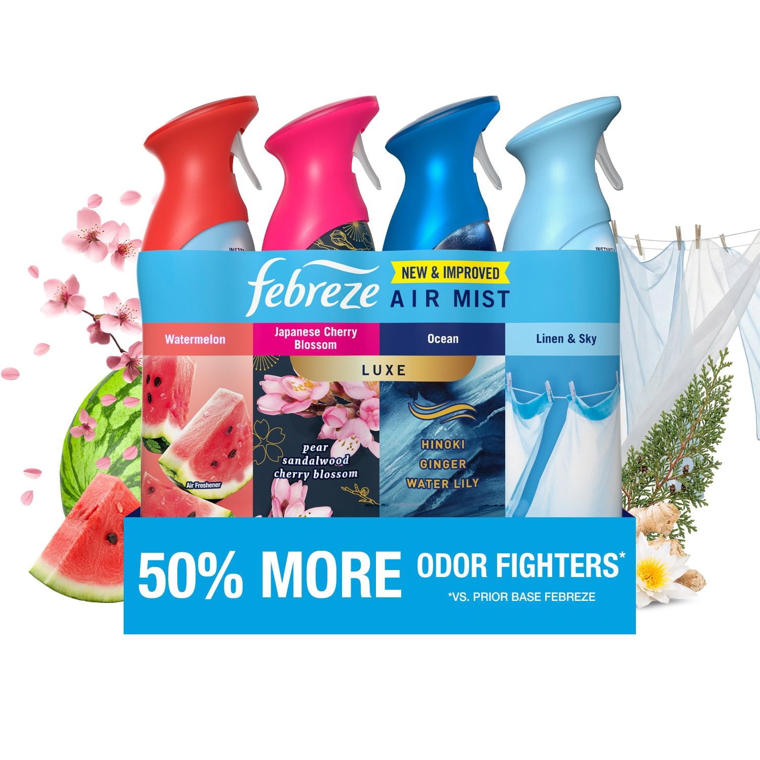 This refreshing Watermelon scent lets you bring the picnic home with a smell that’s always in season... seeds not included. With Febreze Japanese Cherry Blossom, you can bask in sunnier days, enjoying luxurious notes of pear, sandalwood, and cherry blossom. With the edgy-fresh vibes of Febreze Ocean, your well-scented home will never go unnoticed. Bring the outdoors in with the fresh-off-the-clothesline scent of Febreze Linen & Sky.