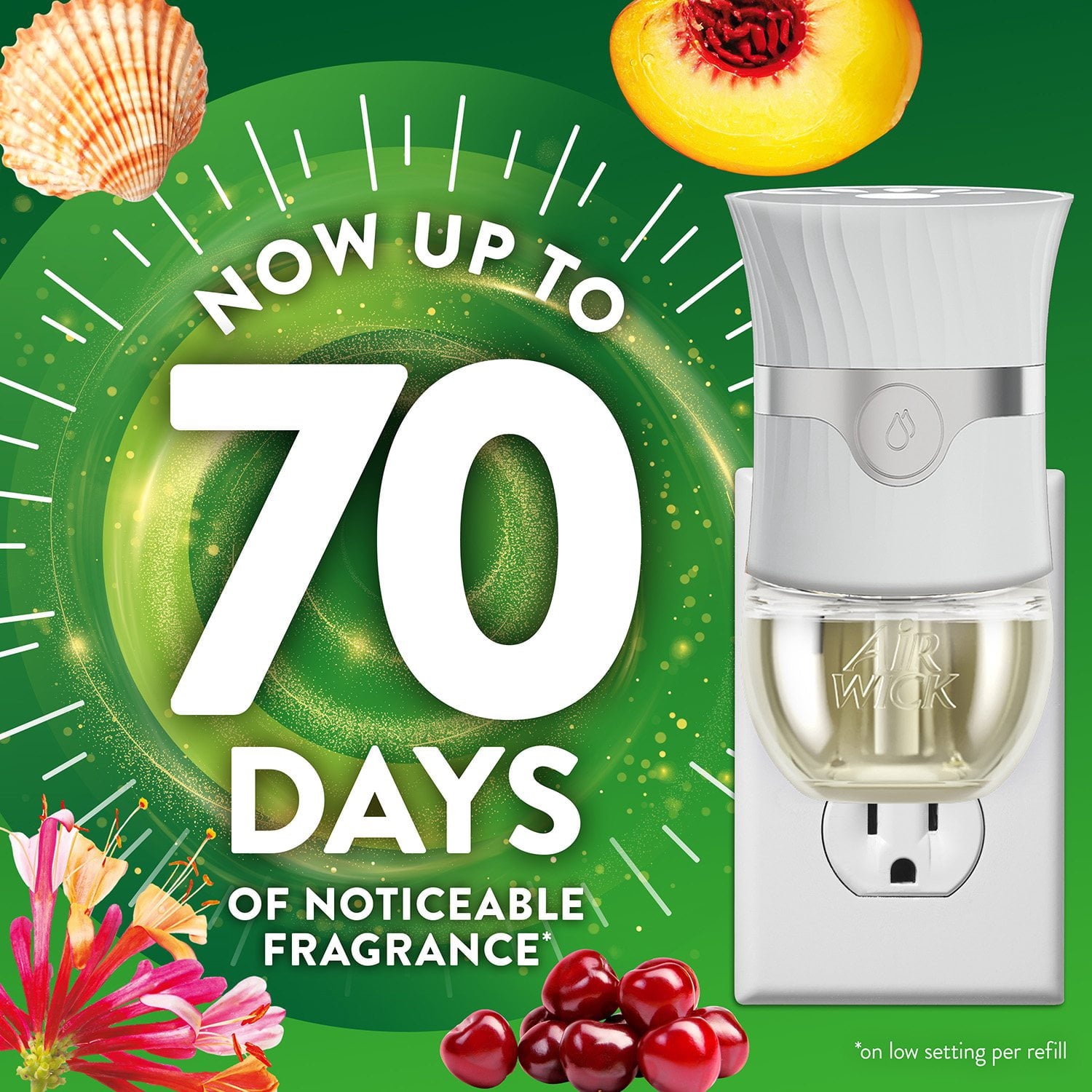 - Each refill lasts up to 70 days on low setting, providing up to 420 days of fragrance per pack