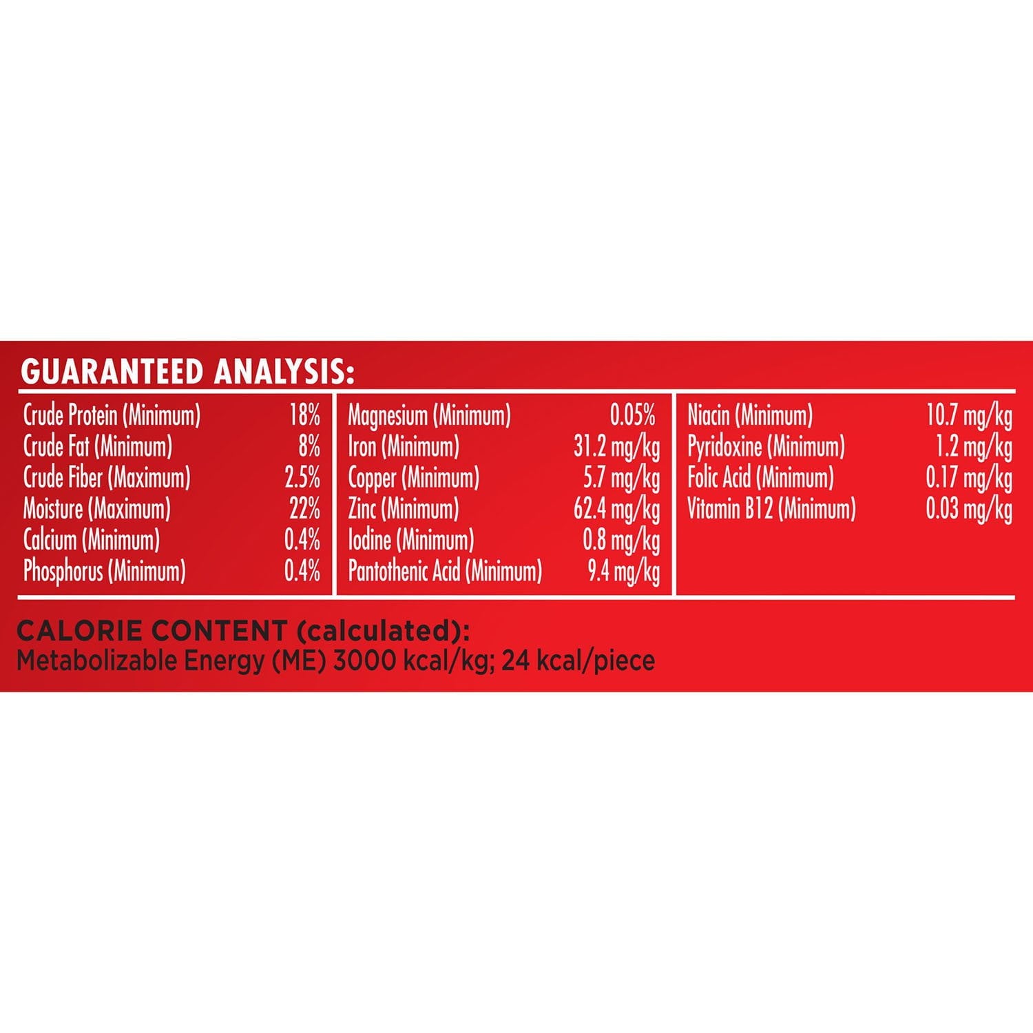 Nutritional Analysis: Crude Protein(Min)...18.0%, Crude Fat(Min)…8.0%, Crude Fiber(Max)…2.5%, Moisture(Max)…22.0%, Calcium(Min)...0.40%, Phosphorus(Min)...0.40%, Magnesium(Min)…0.05%, Iron(Min)…31.2 mg/kg, Copper(Min)...5.7 mg/kg, Zinc(Min)…62.4 mg/kg, Iodine(Min)…0.8 mg/kg, Pantothenic Acid(Min)…9.4 mg/kg, Niacin(Min)…10.7 mg/kg, Pyridoxine(Min)…1.2 mg/kg, Folic Acid(Min)…0.17 mg/kg, Vitamin B12(Min)…0.03 mg/kg