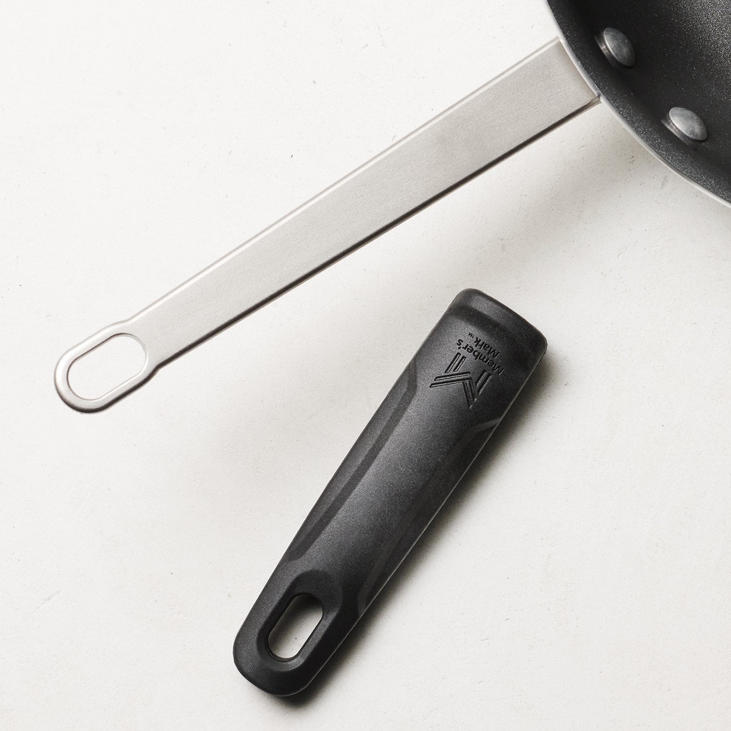 • Riveted cast stainless-steel handle with removable silicone soft-grip