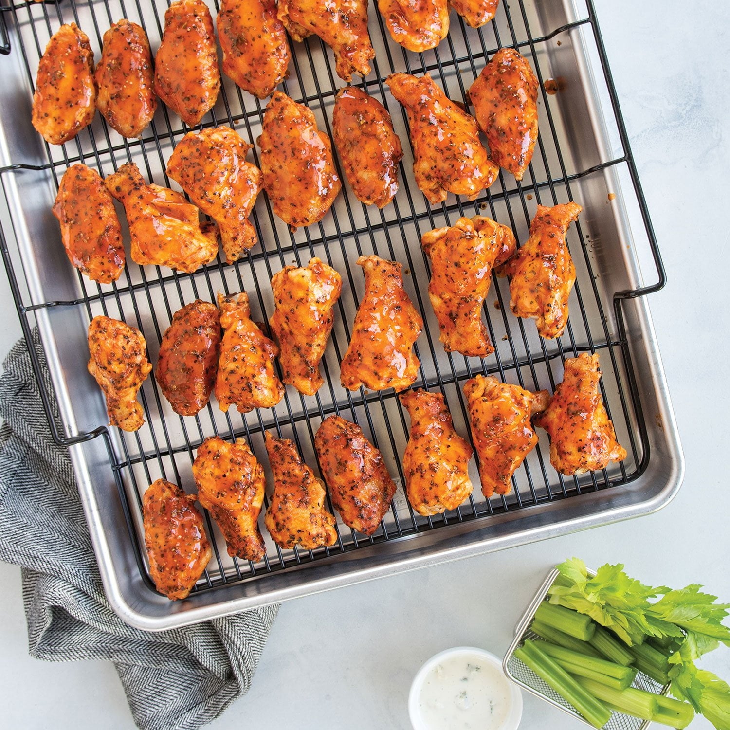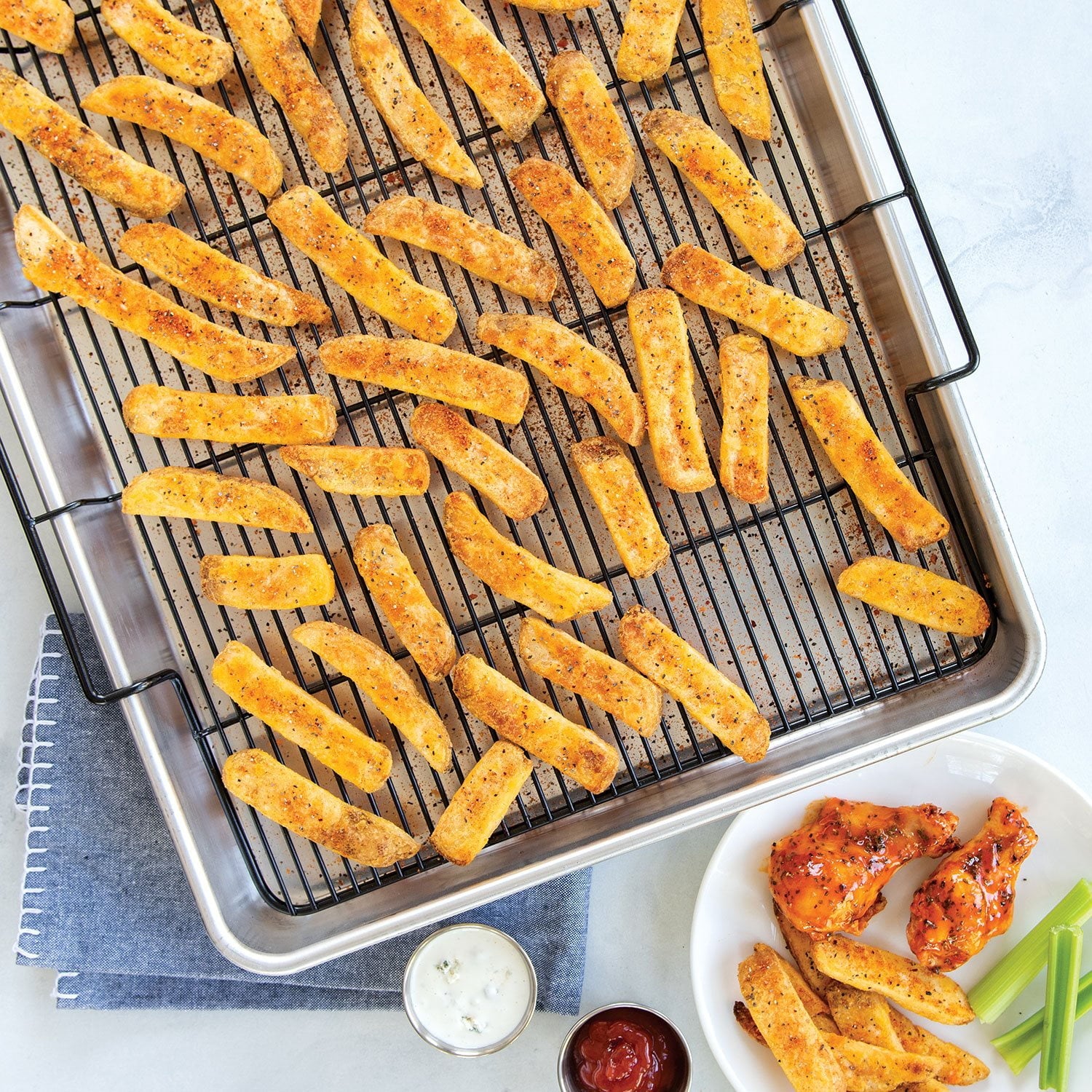 Measuring in at a generous 15 x 21 inches, this pan has higher sides than a standard sheet pan to keep food contained. Its sturdy rack, which is coated in nonstick for simple cleanup, elevates foods above the pan, ensuring air flow around every square inch of your fries, tots, nuggets, jalapeno poppers, and more.