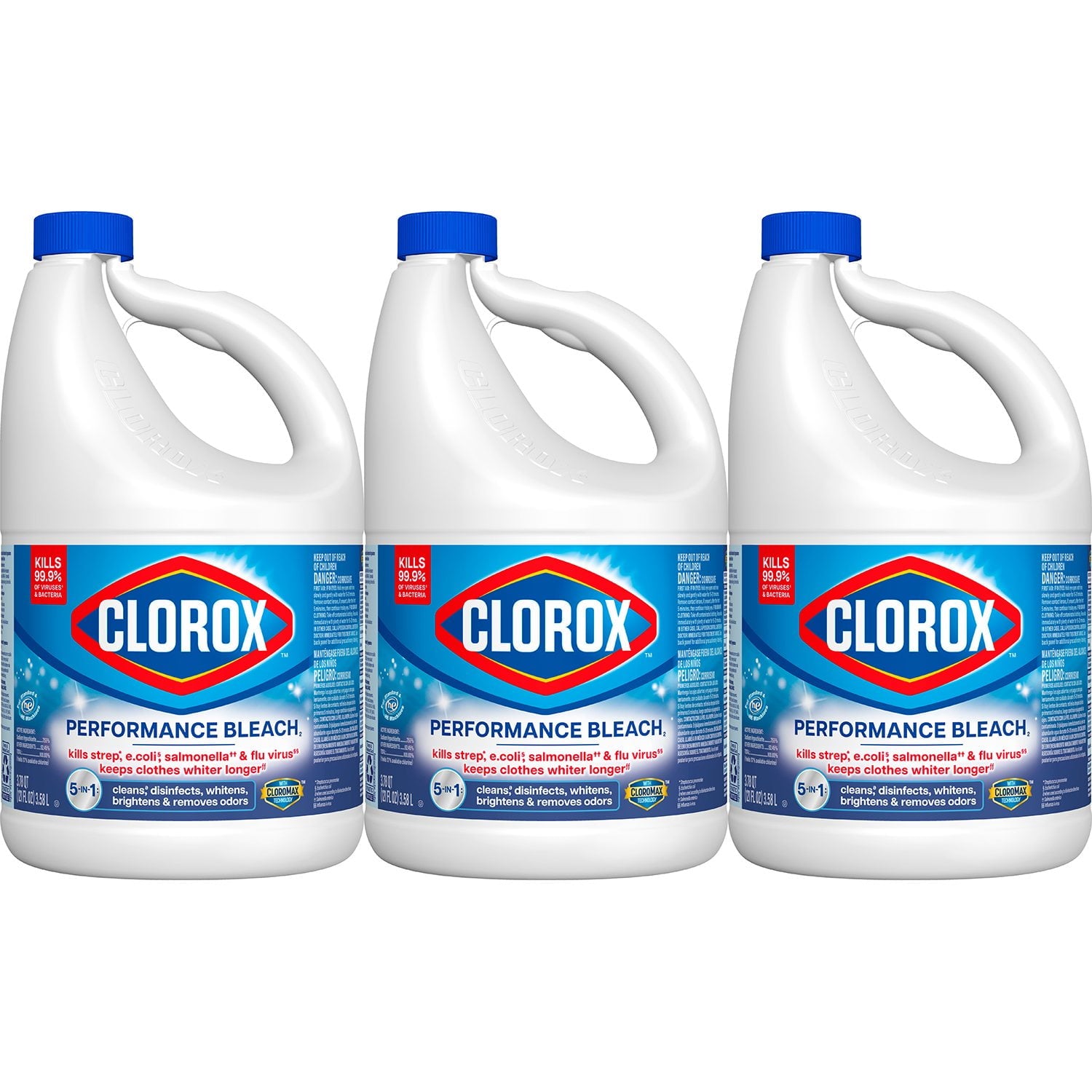 Clorox Performance Bleach is packed with whitening, dirt-fighting, and disinfecting power. It features CloroMax Technology, which not only keeps clothes whiter longer compared to the previous Clorox Performance Bleach but also protects surfaces by reducing soil adhesion. This makes cleaning quicker and easier, saving you time and effort.