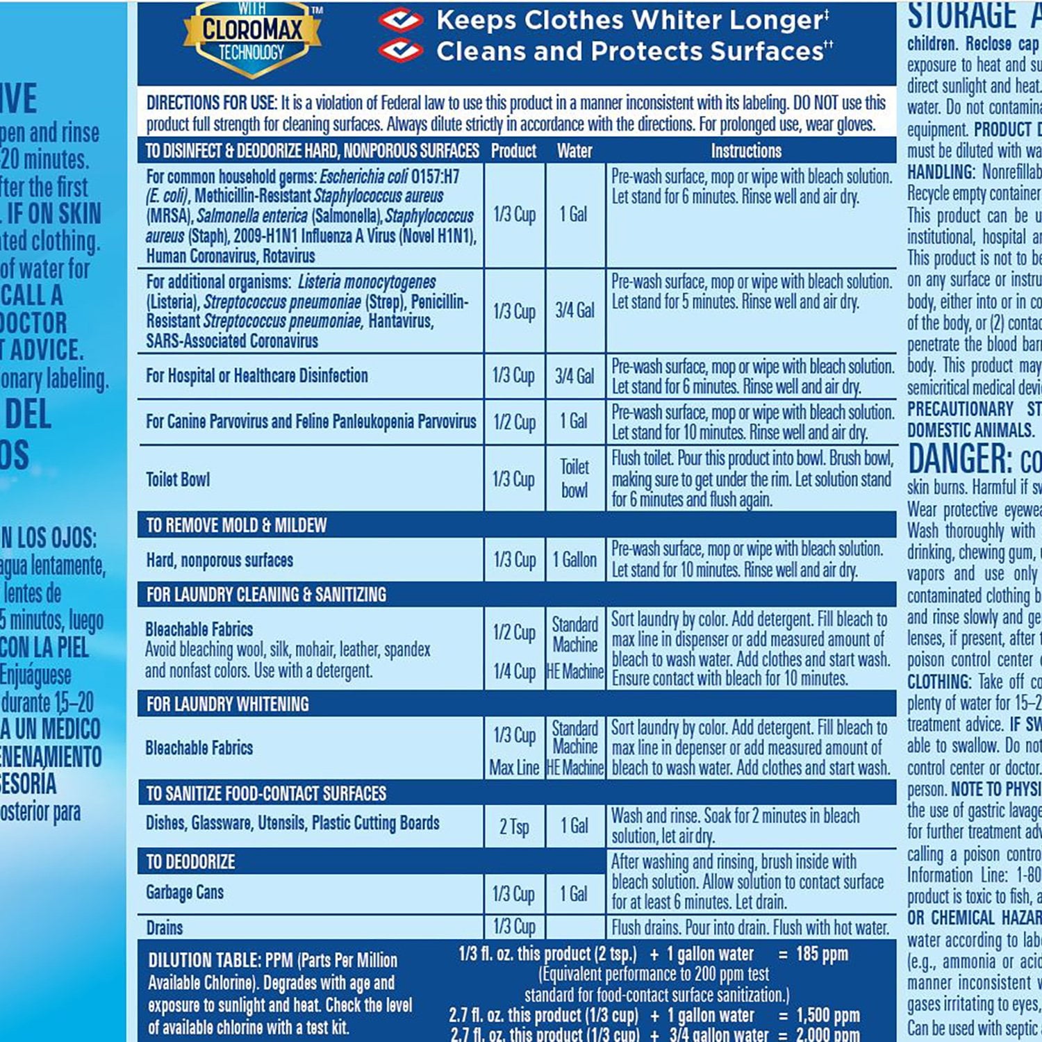 Size / Count: 363 fluid ounces of liquid bleach cleaner in 3 bottles (121 fluid ounces each)Form: LiquidCertifications and Claims: Kills 99% of household germs and bacteria. Removes 70% more stains than detergent alone. Septic safe when used as directed.Allergens / Warnings: Danger: Corrosive. Keep out of reach of children. If in eyes, may cause temporary discomfort; flush thoroughly with water. If swallowed, drink a glass of water to dilute. Hazards to humans and domestic animals. Refer to packaging for more information on warnings and first aid procedures.Color Safe: NoContains Bleach: YesSurface Suitability: This product can be used on hard, nonporous surfaces in commercial, institutional, hospital and household premises, and eating establishments. See product packaging for more information.Use Instructions: Do not use this product full strength for cleaning surfaces. Always dilute strictly in accordance with the directions. For prolonged use, wear gloves. Refer to product packaging for detailed use instructions specific to individual cleaning cases.