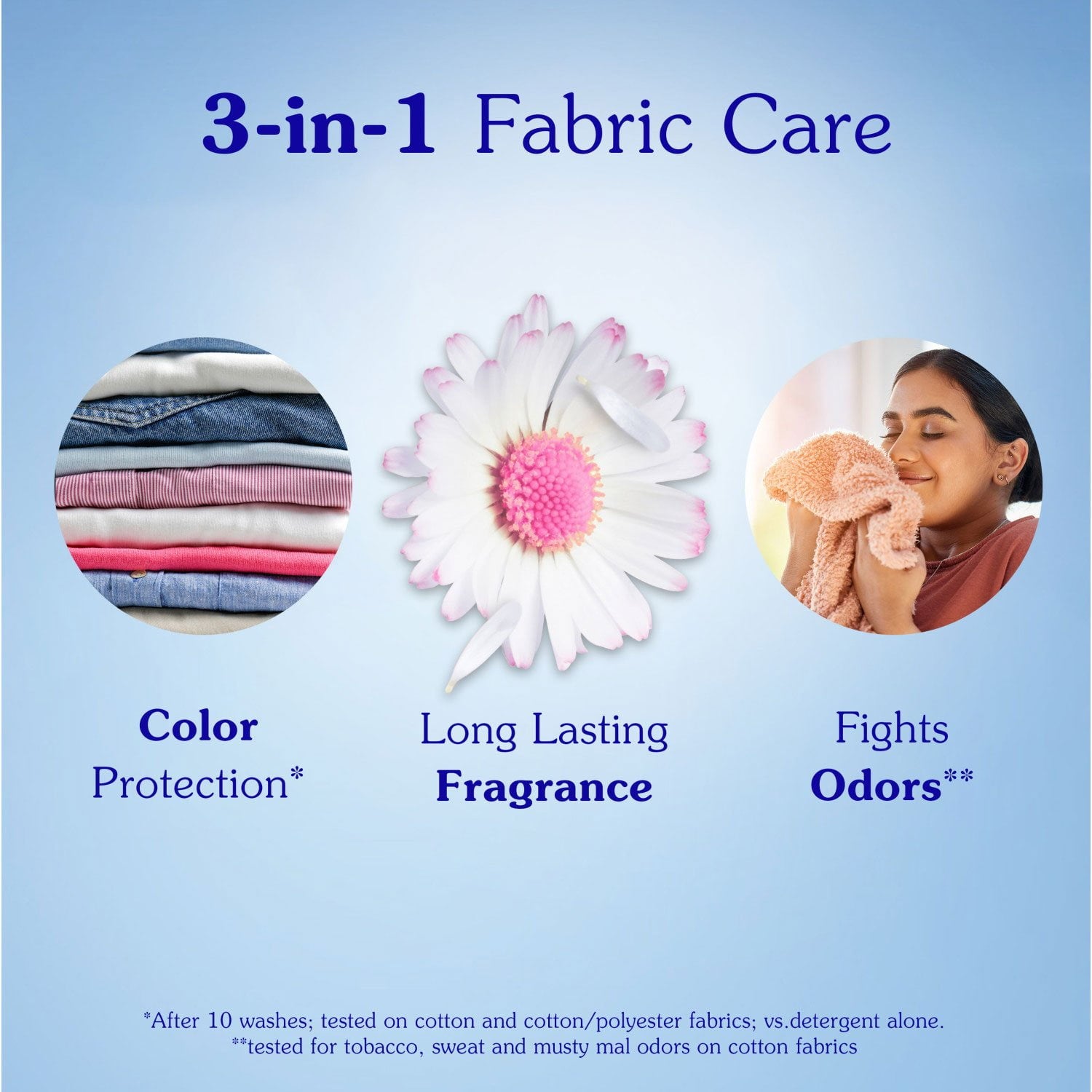 • 3-in-1 fabric care provides softness, color protection, and fights odors