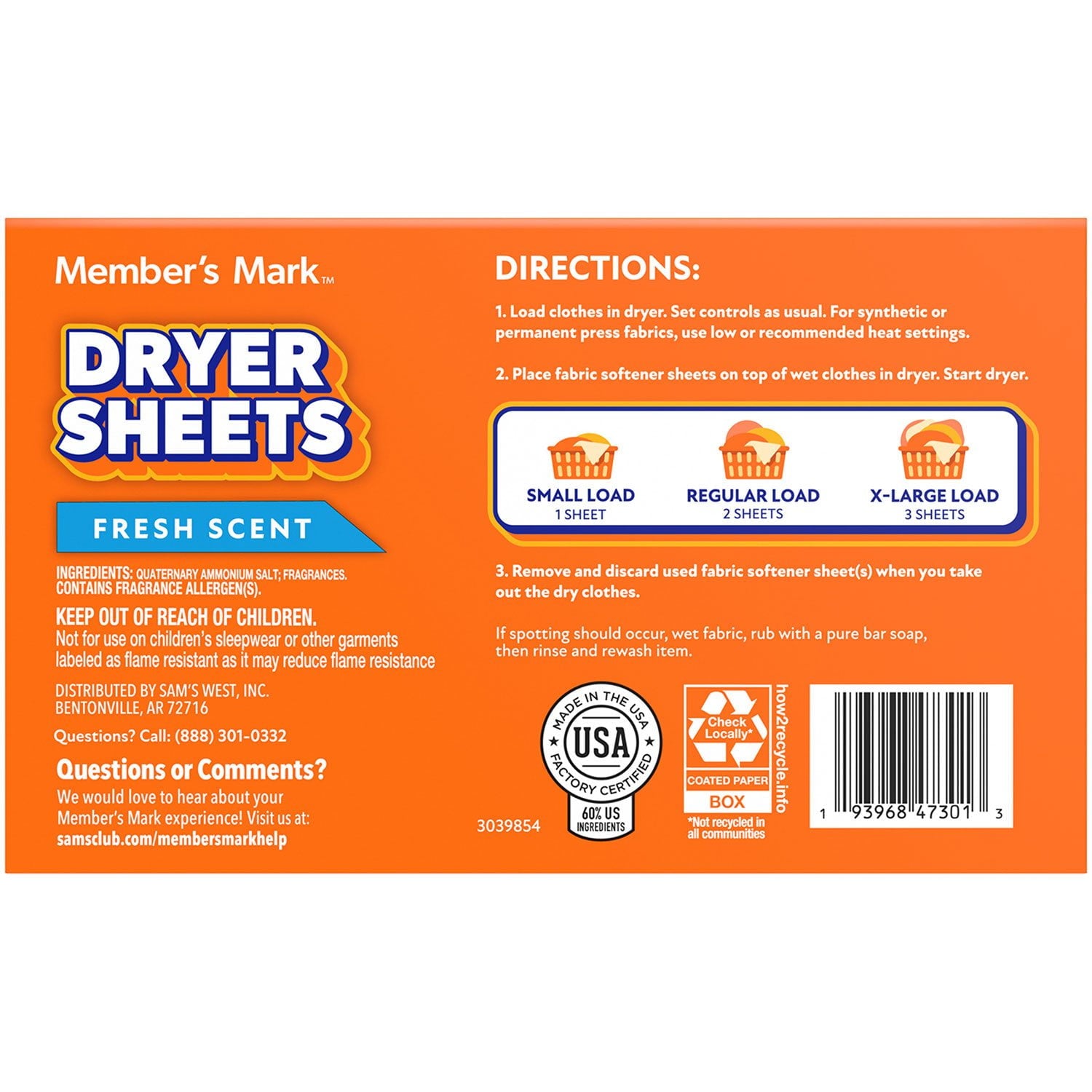 These Member's Mark dryer sheets offer long-lasting freshness, soften fabrics, and help repel hair and lint. Use one dryer sheet for small loads to fight against static and add freshness to your clothes and linens. Two dryer sheets can be used for regular loads for extra static protection and more of the fresh scent and softness. Use three sheets for large loads to repel lint, add softness to your laundry, and fight annoying static. For the best results, add a fresh dryer sheet on top of your clothes before you start drying. These fabric sheets are not recommended for re-use.