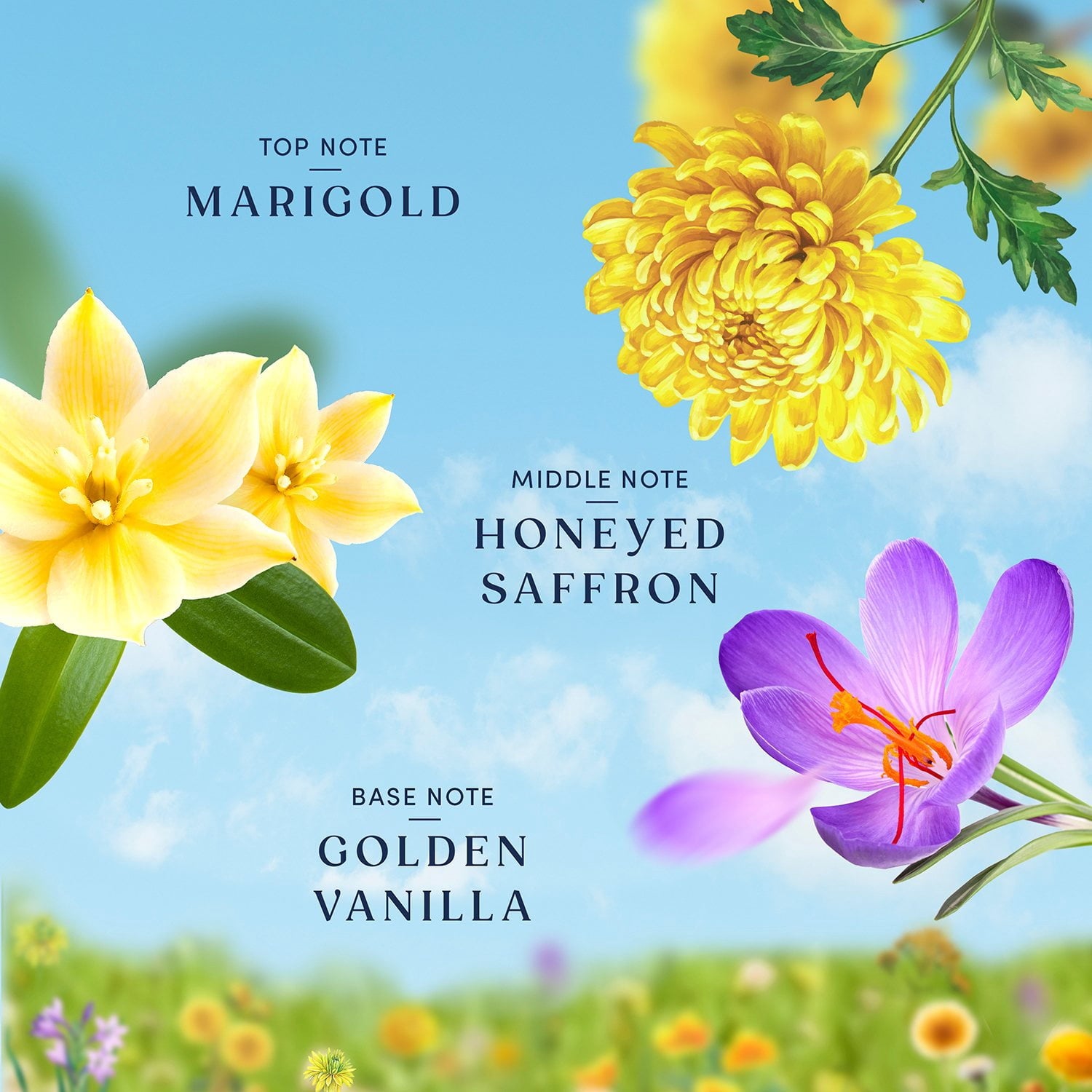 - Downy infuses laundry with scent notes of Marigold, Honeyed Saffron, and Golden Vanilla