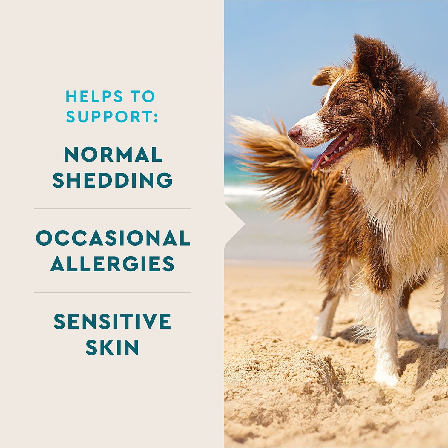 • Contains ingredients, such as Omega-3 Fatty Acids, that help maintain soft skin and support normal dog shedding