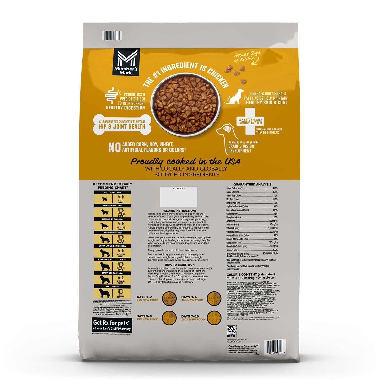 NUTRITIONAL ADEQUACY STATEMENT: Member’s Mark High Protein Grain Free† Chicken & Vegetable Recipe dog food is formulated to meet the nutritional levels established by the AAFCO Dog Food Nutrient Profiles for all life stages including growth of large size dogs (70 lb. or more as an adult).