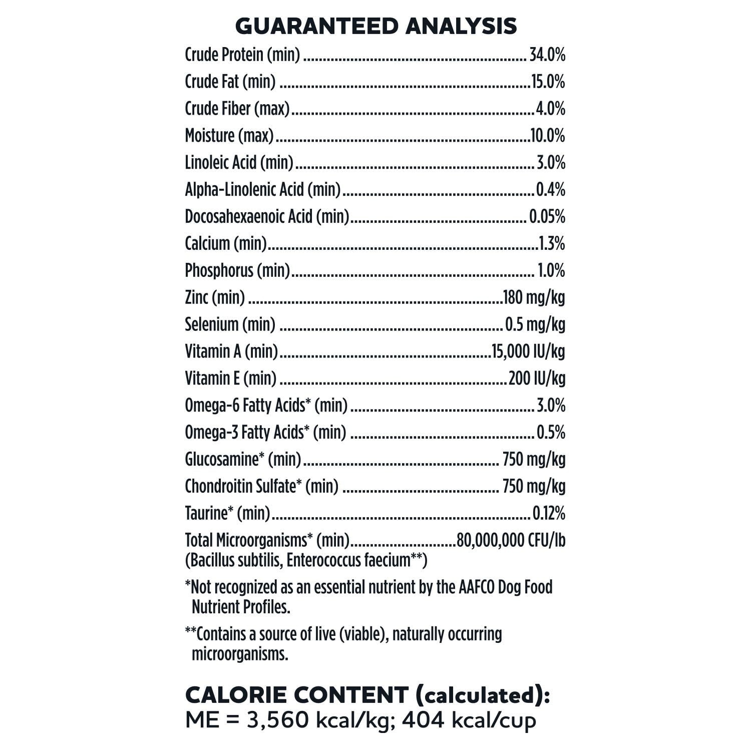 Calorie Content (Calculated): ME = 3,560 kcal/kg; 404 kcal/cup