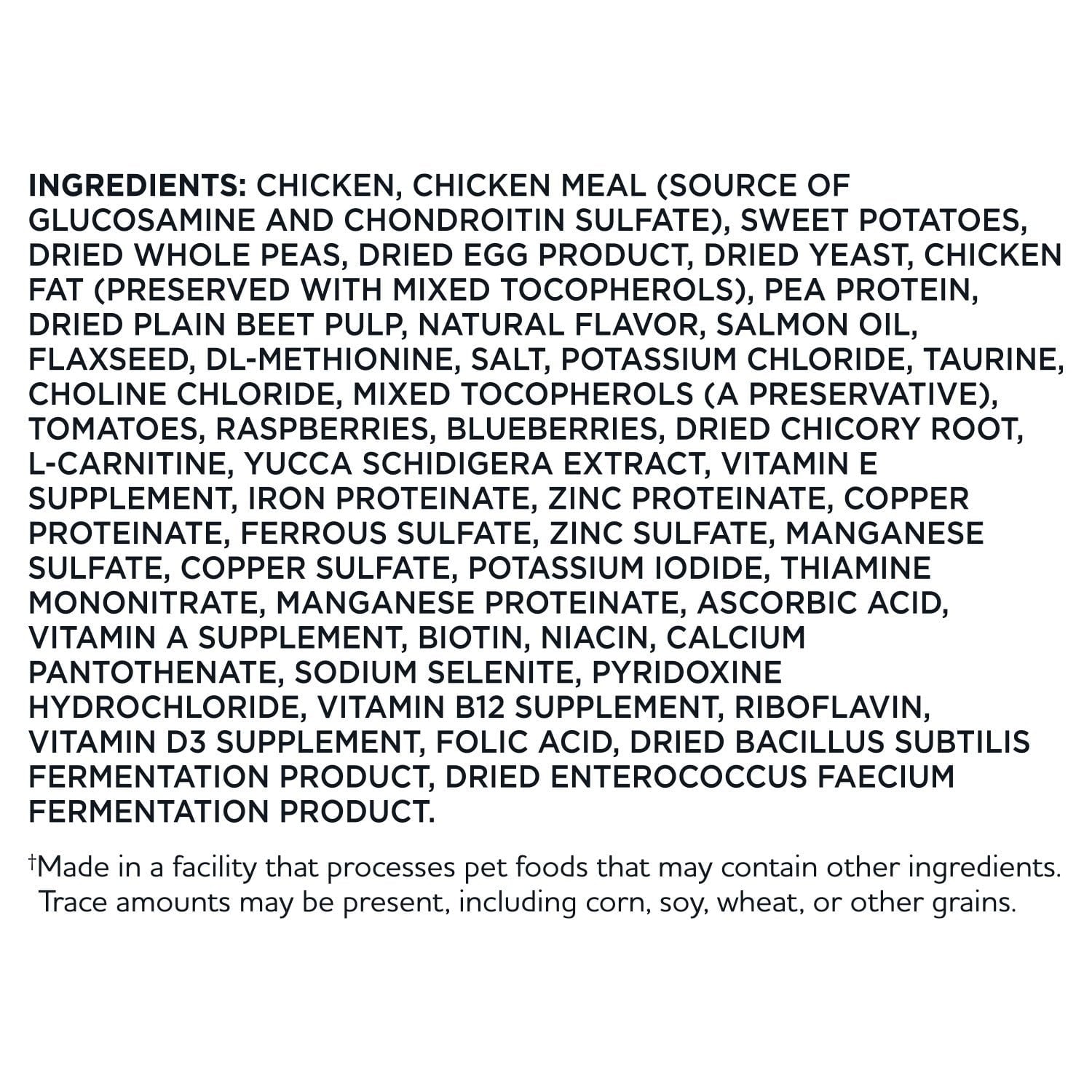 CHICKEN, CHICKEN MEAL (SOURCE OF GLUCOSAMINE AND CHONDROITIN SULFATE), SWEET POTATOES, DRIED WHOLE PEAS, DRIED EGG PRODUCT, DRIED YEAST, CHICKEN FAT (PRESERVED WITH MIXED TOCOPHEROLS), PEA PROTEIN, DRIED PLAIN BEET PULP, NATURAL FLAVOR, SALMON OIL, FLAXSEED, DL-METHIONINE, SALT, POTASSIUM CHLORIDE, TAURINE, CHOLINE CHLORIDE, MIXED TOCOPHEROLS (A PRESERVATIVE), TOMATOES, RASPBERRIES, BLUEBERRIES, DRIED CHICORY ROOT, L-CARNITINE, YUCCA SCHIDIGERA EXTRACT, VITAMIN E SUPPLEMENT, IRON PROTEINATE, ZINC PROTEINATE, COPPER PROTEINATE, FERROUS SULFATE, ZINC SULFATE, MANGANESE SULFATE, COPPER SULFATE, POTASSIUM IODIDE, THIAMINE MONONITRATE, MANGANESE PROTEINATE, ASCORBIC ACID, VITAMIN A SUPPLEMENT, BIOTIN, NIACIN, CALCIUM PANTOTHENATE, SODIUM SELENITE, PYRIDOXINE HYDROCHLORIDE, VITAMIN B12 SUPPLEMENT, RIBOFLAVIN, VITAMIN D3 SUPPLEMENT, FOLIC ACID, DRIED BACILLUS SUBTILIS FERMENTATION PRODUCT, DRIED ENTEROCOCCUS FAECIUM FERMENTATION PRODUCT.