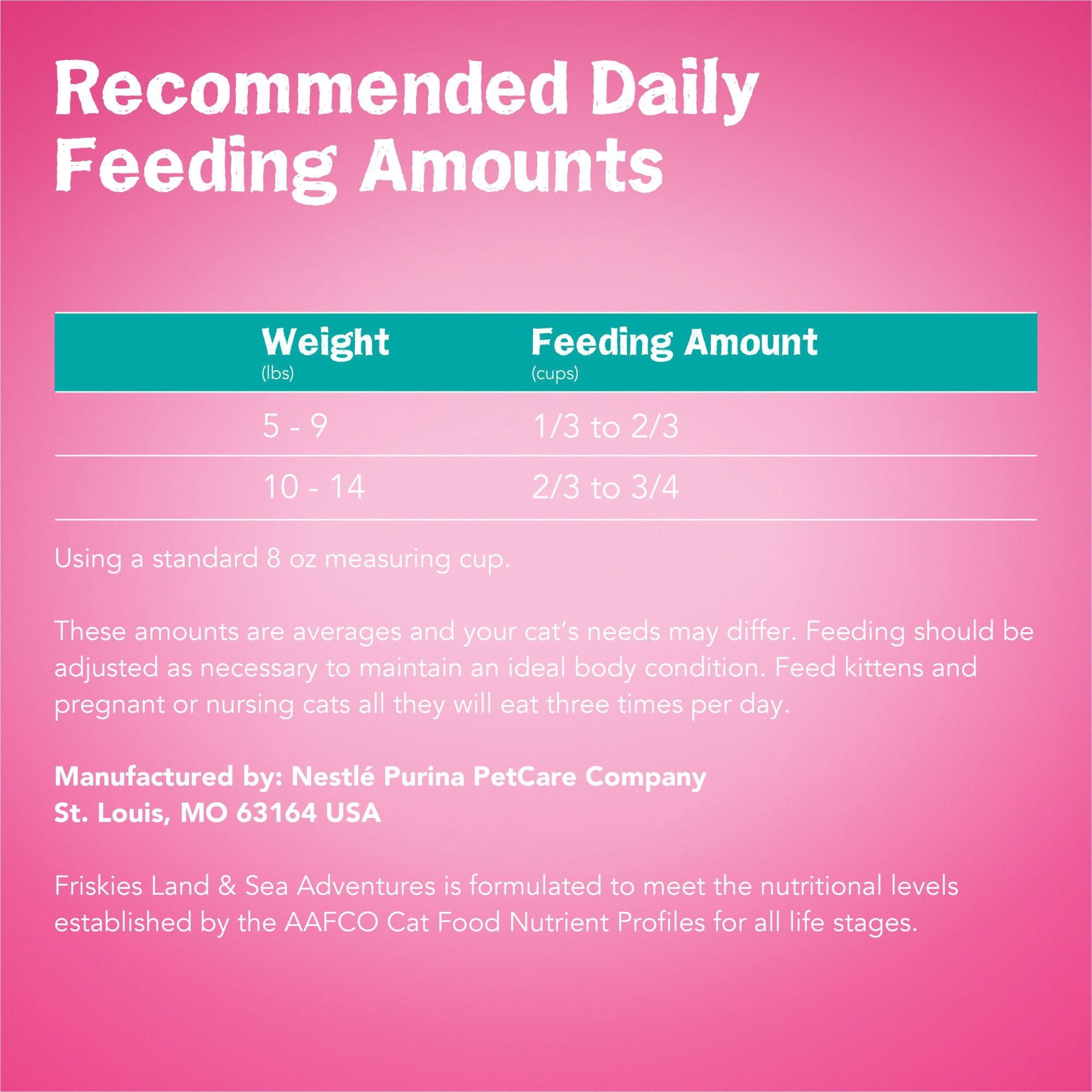 Feeding Instructions: Feeding Adult Cats: Feed 1/2 the indicated amount twice a day. Or you can fill the bowl with the entire amount every morning. Some cats will eat more or less, depending on their age, weight and size. Feed to maintain ideal body condition. Feeding Kittens: Kittens generally nibble solid foods at 3 - 4 weeks of age. Keep moistened Friskies Land & Sea Adventures available to these kittens at all times. Just add one part liquid to three parts Friskies Land & Sea Adventures, changing frequently to ensure freshness. After weaning, at 6 - 8 weeks of age, kittens will normally eat dry or moistened food at will. Start a self-feeding program, leaving food in the dish at all times. Feeding amounts should be adjusted as necessary to help your kitten maintain an ideal body condition. Feeding For Reproduction: Friskies Land & Sea Adventures provides the extra nutrition needed by reproducing females in stages of gestation and lactation. Food consumption may vary during gestation, so feed the amount needed to maintain the pregnant female’s good body condition. Food intake may double or even quadruple during lactation. Provide adequate fresh water in a clean container daily. For your pet’s health, see your veterinarian regularly.