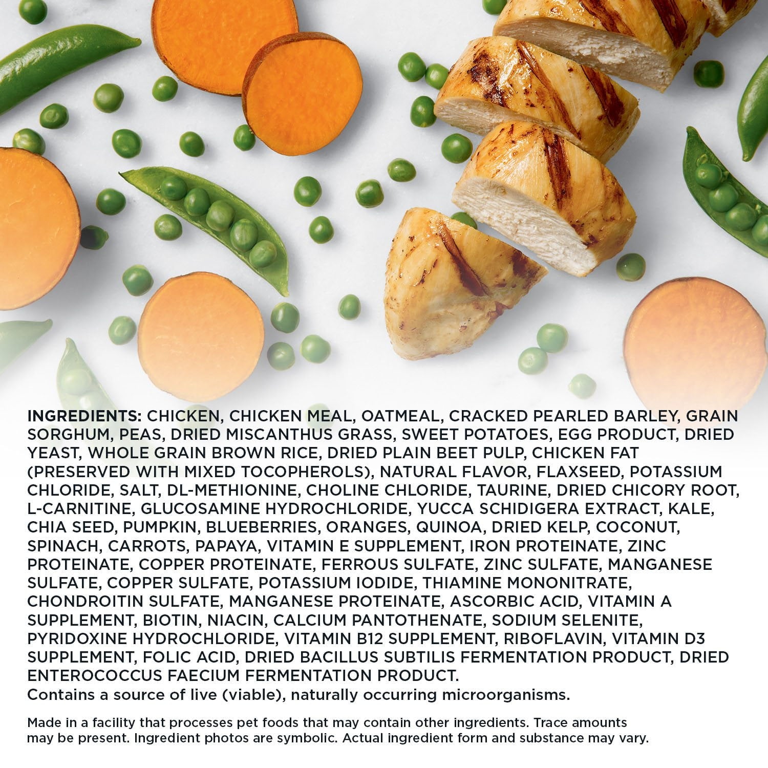 | Ingredient List: | Chicken, Chicken Meal, Oatmeal, Cracked Pearled Barley, Grain Sorghum, Peas, Dried Miscanthus Grass, Sweet Potatoes, Egg Product, Dried Yeast, Whole Grain Brown Rice, Dried Plain Beet Pulp, Chicken Fat (Preserved With Mixed Tocopherols), Natural Flavor, Flaxseed, Potassium Chloride, Salt, Dl-Methionine, Choline Chloride, Taurine, Dried Chicory Root, L-Carnitine, Glucosamine Hydrochloride, Yucca Schidigera Extract, Kale, Chia Seed, Pumpkin, Blueberries, Oranges, Quinoa, Dried Kelp, Coconut, Spinach, Carrots, Papaya, Vitamin E Supplement, Iron Proteinate, Zinc Proteinate, Copper Proteinate, Ferrous Sulfate, Zinc Sulfate, Manganese Sulfate, Copper Sulfate, Potassium Iodide, Thiamine Mononitrate, Chondroitin Sulfate, Manganese Proteinate, Ascorbic Acid, Vitamin A Supplement, Biotin, Niacin, Calcium Pantothenate, Sodium Selenite, Pyridoxine Hydrochloride, Vitamin B12 Supplement, Riboflavin, Vitamin D3 Supplement, Folic Acid, Dried Bacillus Subtilis Fermentation Product, Dried Enterococcus Faecium Fermentation Product |