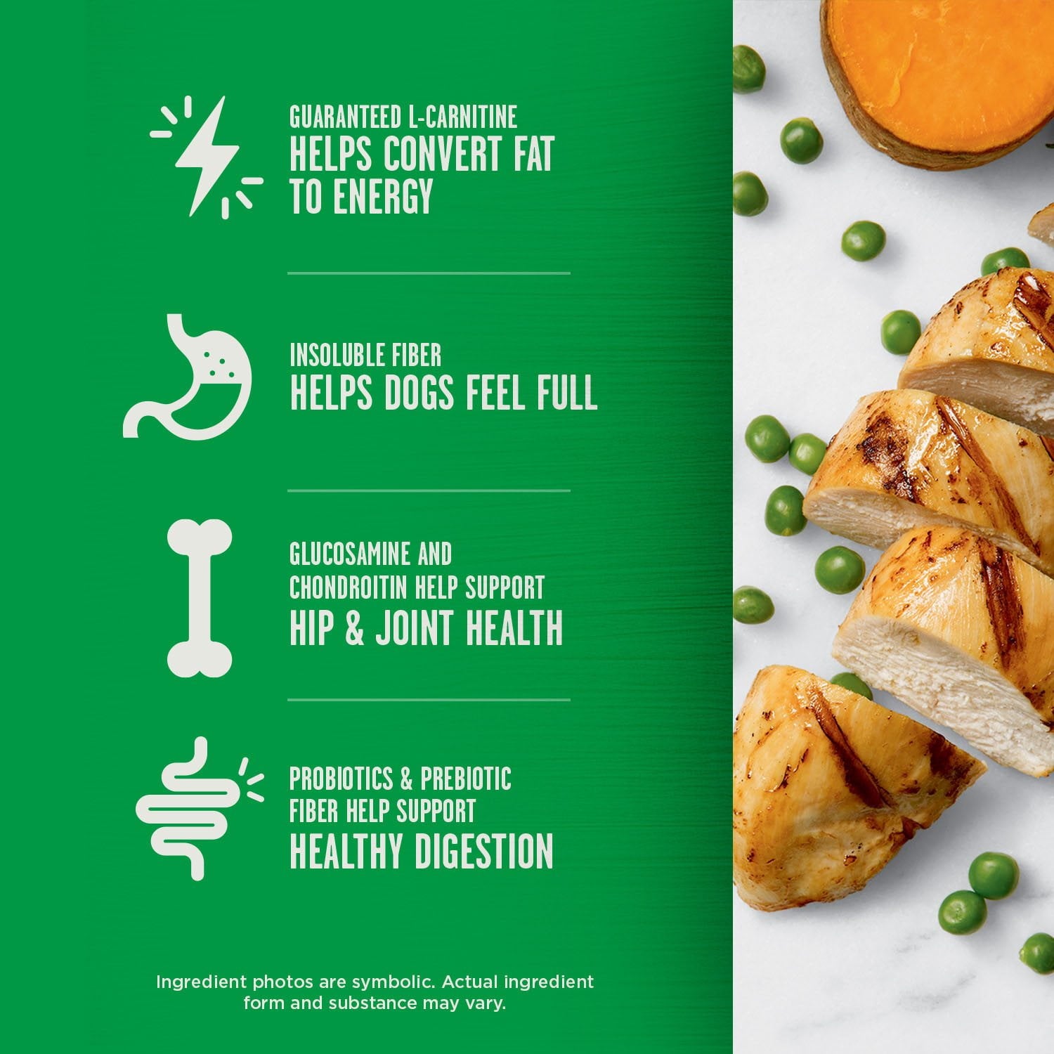 | Key Health Benefit: | 5-in-1 Support: Added levels of glucosamine & chondroitin to help support hip & joint health. Omega Fatty Acids to help support a healthy immune system. Probiotics and Prebiotic Fiber to help support healthy digestion. Guaranteed L-Carnitine to help convert fat to energy. Isoluble Fiber to help dogs feel full. |