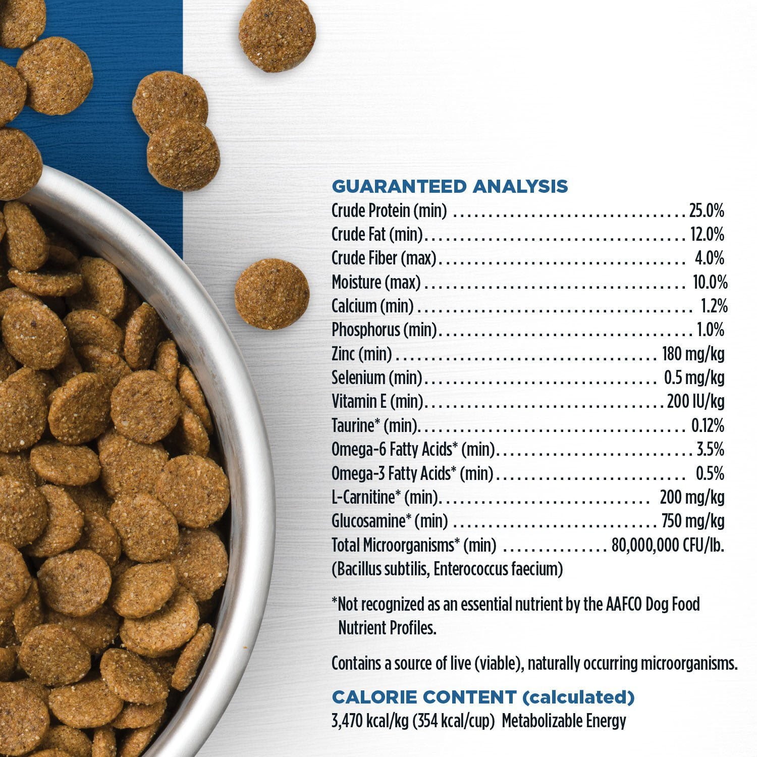 Guaranteed Analysis: Crude Protein (min) 25.0%; Crude Fat (min) 12.0%;Crude Fiber (max) 4.0%; Moisture (max) 10.0%, Calcium 1.2% (min), Phosphorus, 1.0% (min), Zinc (min) 180 mg/kg, Selenium (min) 0.5 mg/kg, Vitamin E (min) 200 IU/kg, Taurine* (min) 0.12%, Omega-6 Fatty Acids* (min) 3.5% Omega-3 Fatty Acids* (min) 0.5%, L-Carnitine* (min). 200 mg/kg, Glucosamine* (min).750 mg/kg, Total Microorganisms* (min) 80,000,000 CFU/lb (Bacillus subtilis, Enterococcus faecium)