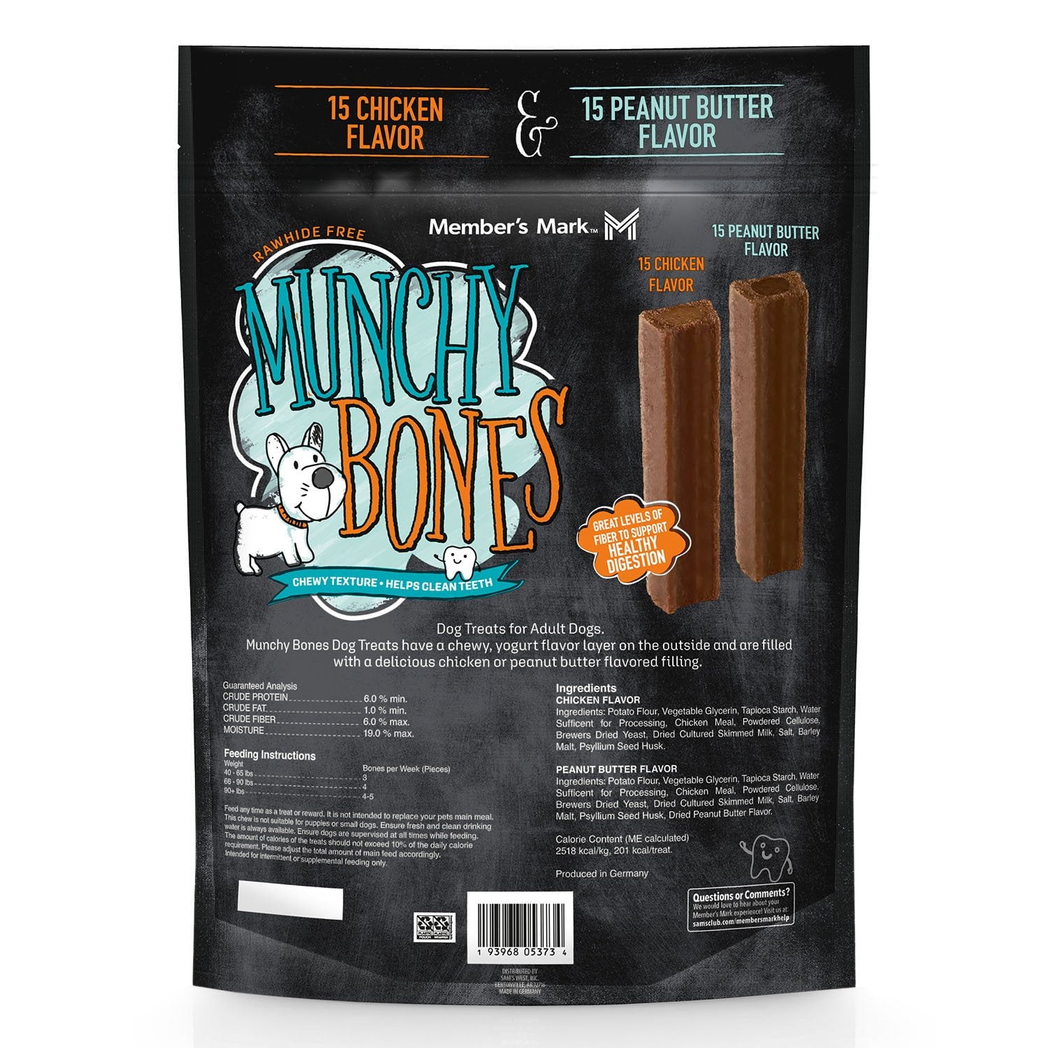Member’s Mark Munchy Bones (30 ct.) are an ideal treat for adult dogs. These treats have a chewy, yogurt flavor layer on the outside and are filled with a delicious chicken or peanut butter flavored filling. In addition, these treats are rawhide, grain, corn and soy free–and contain neither artificial colors/flavors nor preservatives. Member's Mark Munchy Bones are made in Germany and were developed with veterinarians.