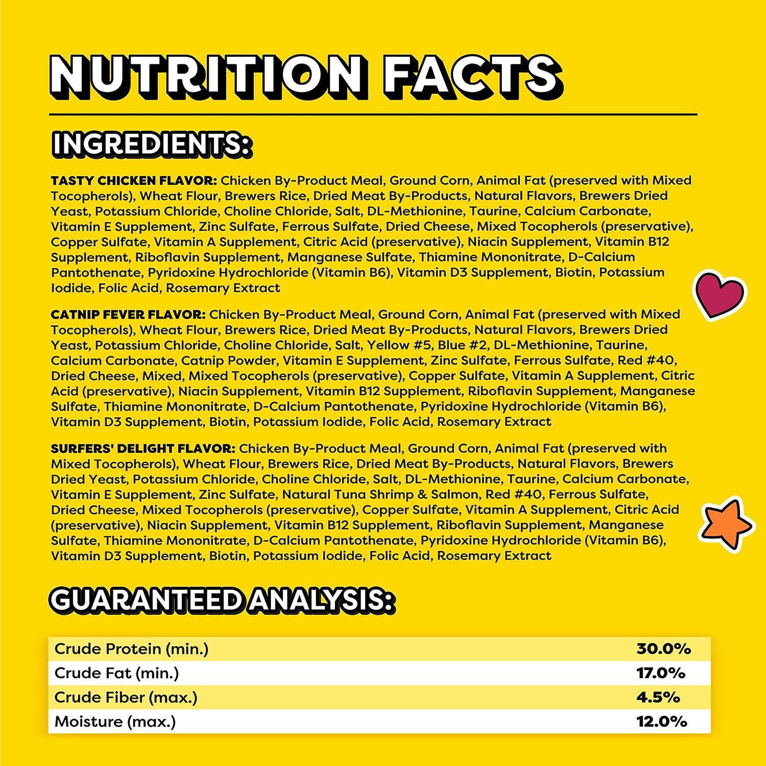 Ingredients List (Catnip Fever): Catnip Fever: Chicken By-Product Meal, Ground Corn, Animal Fat (preserved with Mixed Tocopherols), Wheat Flour, Brewers Rice, Dried Meat By-Products, Natural Flavors, Brewers Dried Yeast, Potassium Chloride, Choline Chloride, Salt, Yellow #5, Blue #2, DL-Methionine, Taurine, Calcium Carbonate, Catnip Powder, Vitamin E Supplement, Zinc Sulfate, Ferrous Sulfate, Red #40, Dried Cheese, Mixed Tocopherols (preservative), Copper Sulfate, Vitamin A Supplement, Citric Acid (preservative), Niacin Supplement, Vitamin B12 Supplement, Riboflavin Supplement, Manganese Sulfate, Thiamine Mononitrate, D-Calcium Pantothenate, Pyridoxine Hydrochloride (Vitamin B6), Vitamin D3 Supplement, Biotin, Potassium Iodide, Folic Acid, Rosemary Extract