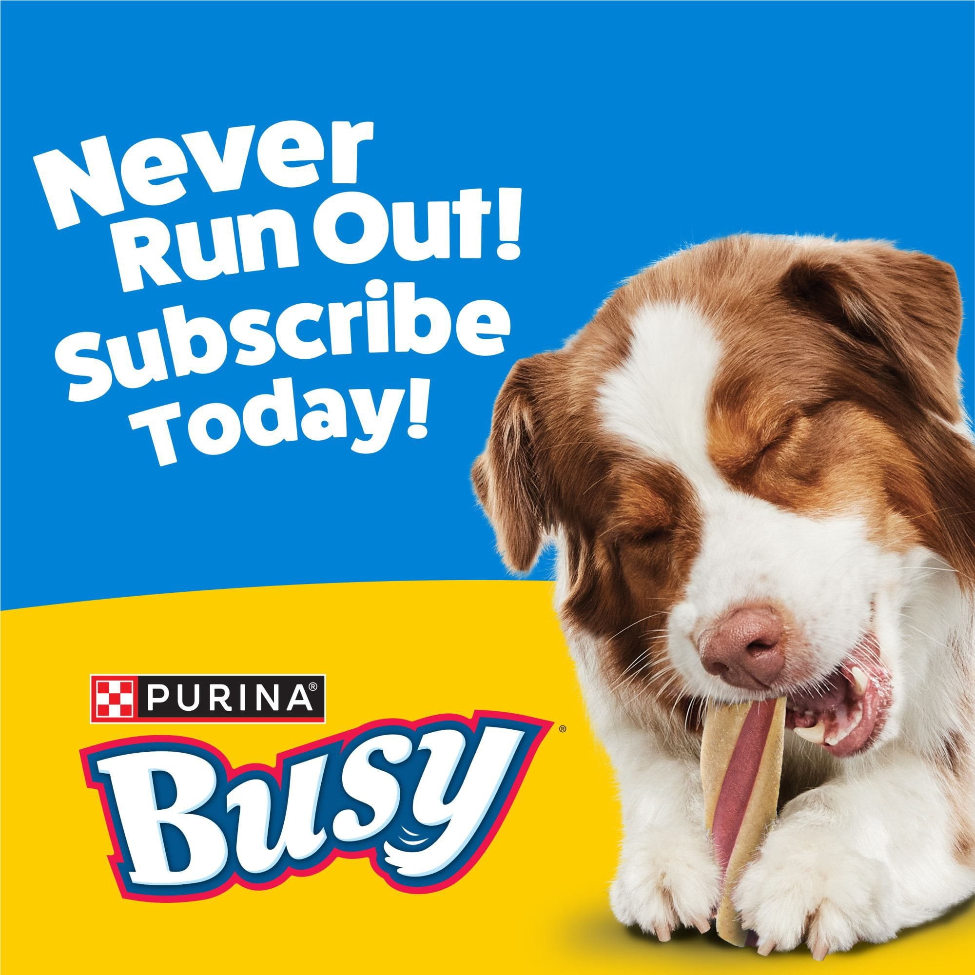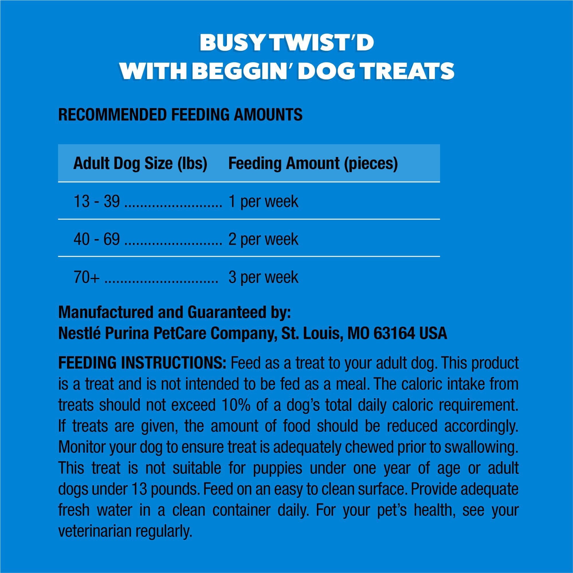 Feed Purina Busy With Beggin' Twist'd treats as a snack to your adult dog. Ensure the caloric intake from treats does not exceed 10% of their daily requirement, and adjust their food portions accordingly. These treats are not suitable for puppies under one year of age or adult dogs under 13 pounds. Always monitor your dog while they enjoy their treat and provide fresh water daily. For your pet's health, consult your veterinarian regularly.