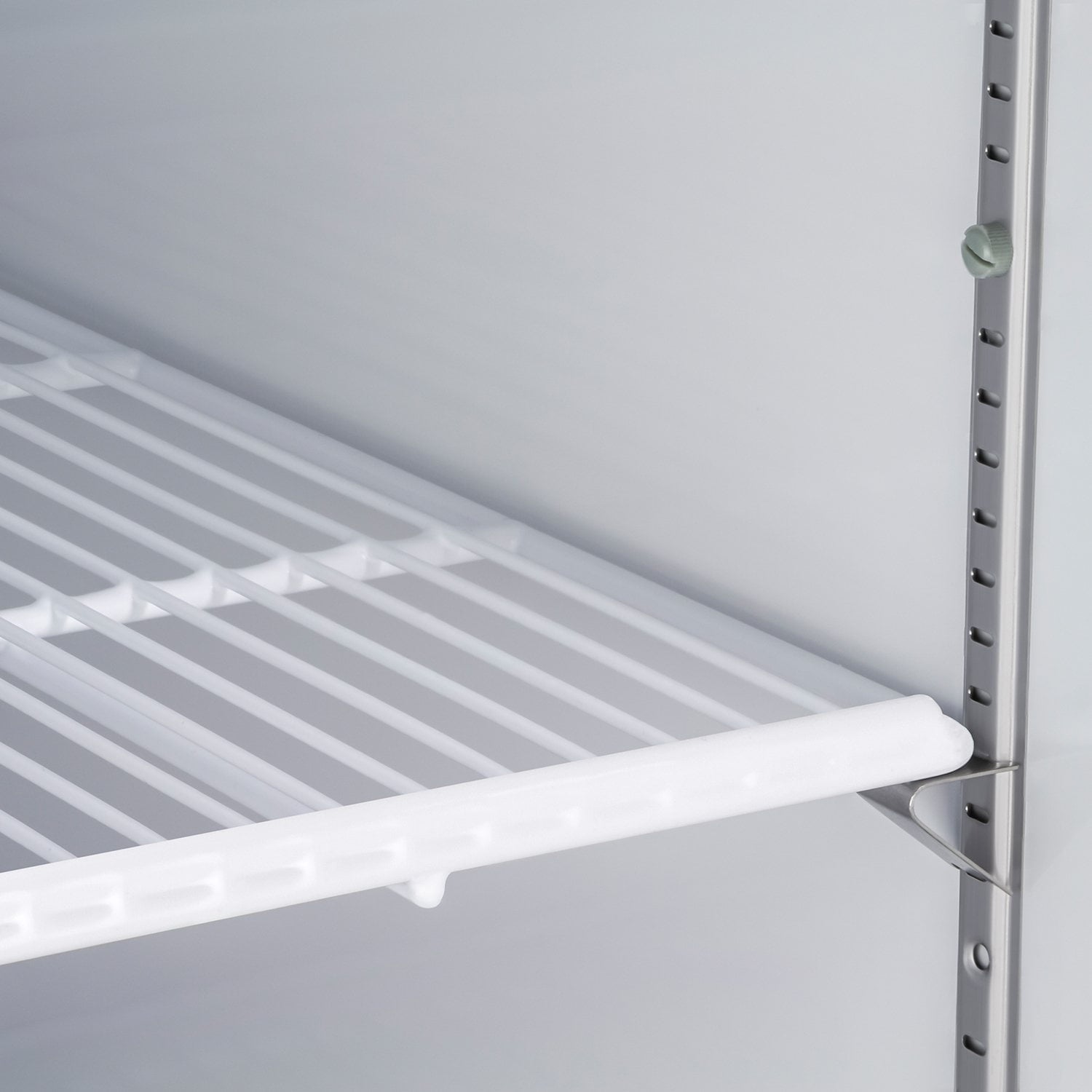 The cabinet is equipped with six heavy-duty fully adjustable and easy-to-clean PE-coated wire shelves that can hold full-size sheet pans and provides up to 49 cubic ft. (1387 L) of storage capacity, while its solid and slender build makes it a great choice for limited spaces. In addition, the double-door commercial refrigerator model is engineered with an open-door alert that beeps if the refrigerator is left open for three minutes.