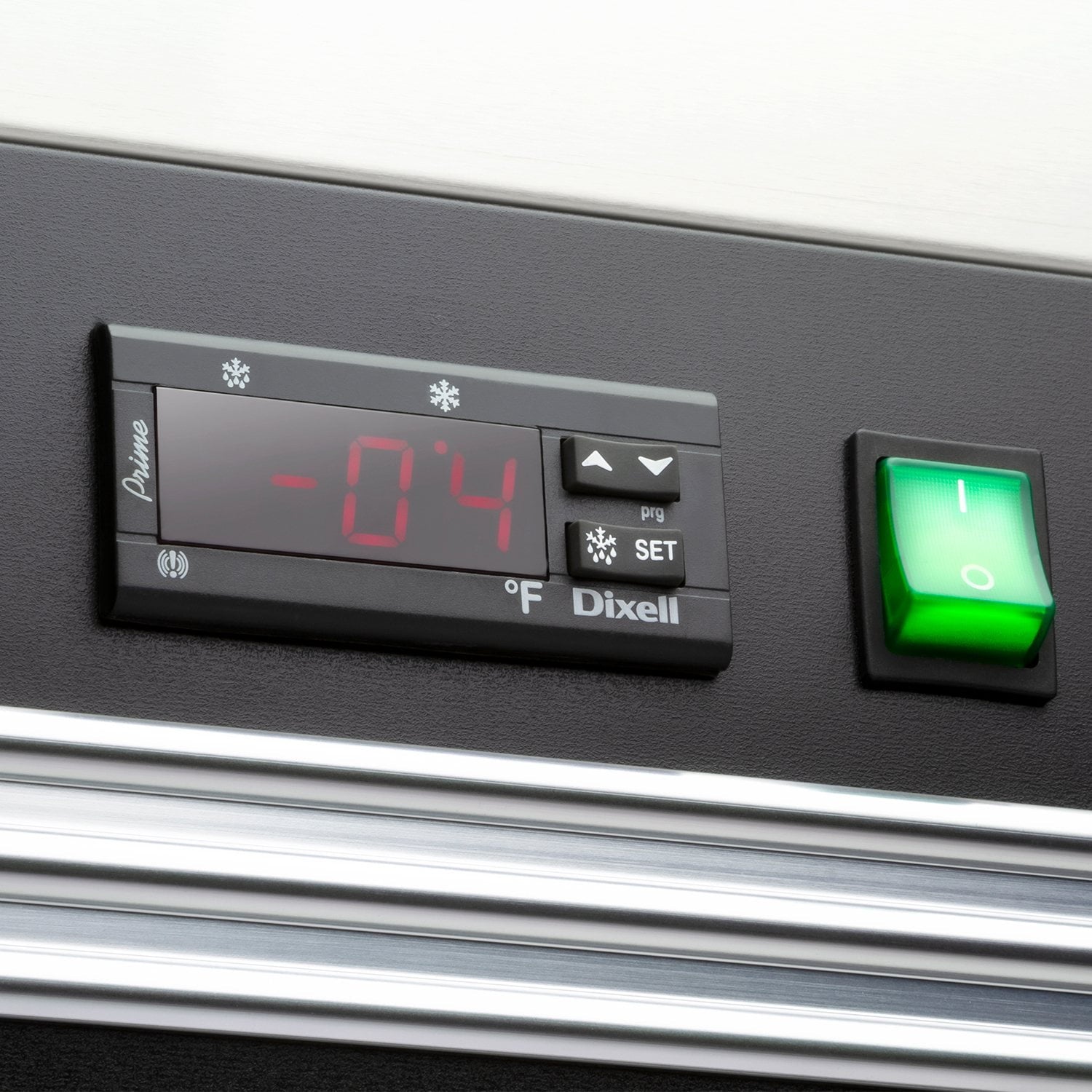 The digital temperature display can be viewed from outside the cabinet, engineered with an integrated condensate evaporator; no drain line connection is needed. The urethane foam insulation on this two-door commercial refrigerator provides outstanding thermal regulation and is energy efficient.