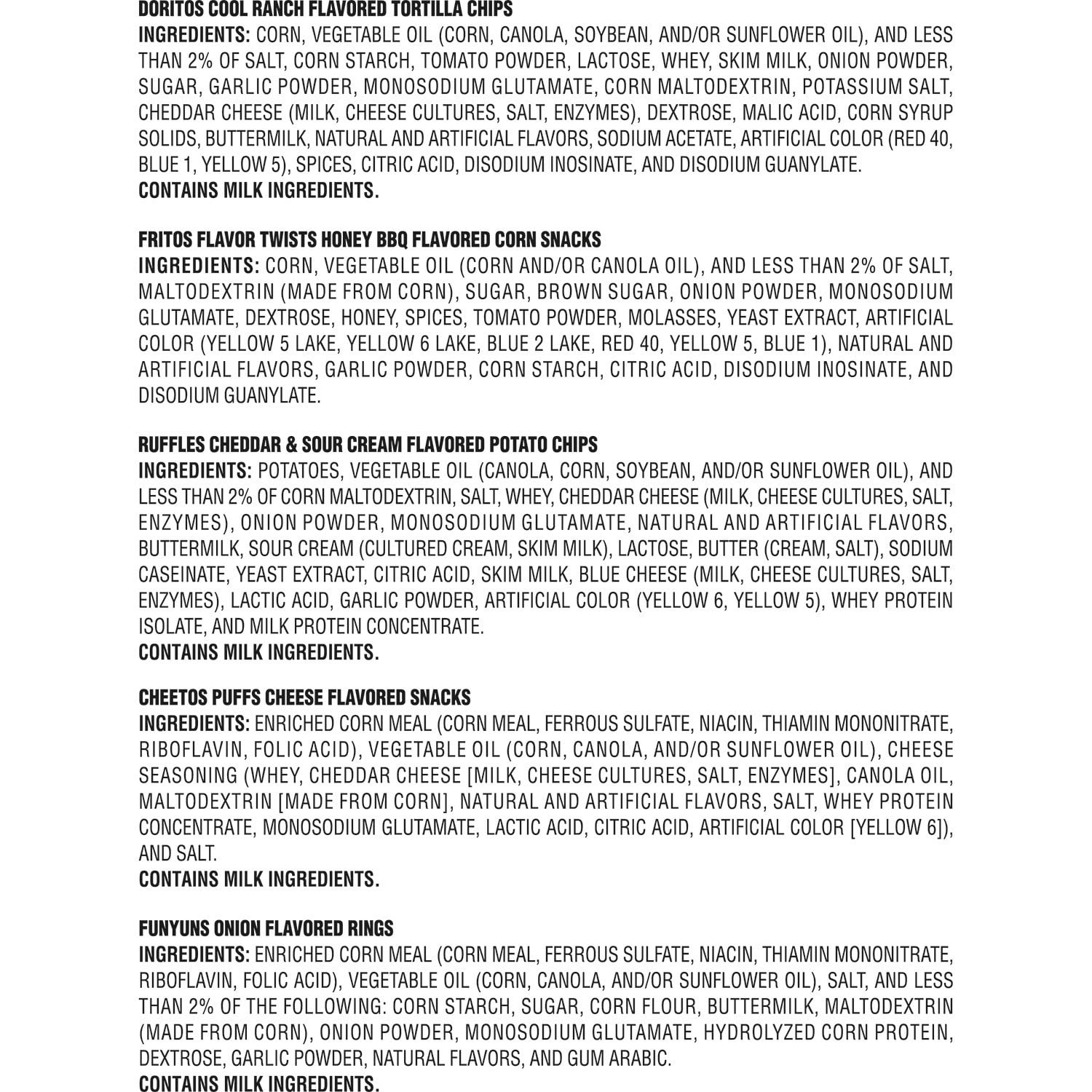6 - Doritos Cool Ranch5 - Fritos Twists Honey BBQ8 - Ruffles Cheddar & Sour Cream6 - Cheetos Puffs5 - FunyunsRuffles Cheddar & Sour Cream Flavored Potato Chips Ingredients: Potatoes, Vegetable Oil (Canola, Corn, Soybean, And/Or Sunflower Oil), Maltodextrin (Made From Corn), Salt, Whey, Cheddar Cheese (Milk, Cheese Cultures, Salt, Enzymes), Onion Powder, Monosodium Glutamate, Natural And Artificial Flavors, Buttermilk, Sour Cream (Cultured Cream, Skim Milk), Lactose, Butter (Cream, Salt), Sodium Caseinate, Yeast Extract, Citric Acid, Skim Milk, Blue Cheese (Milk, Cheese Cultures, Salt, Enzymes), Lactic Acid, Garlic Powder, Artificial Color (Yellow 6, Yellow 5), Whey Protein Isolate, And Milk Protein Concentrate. Contains milk ingredients.