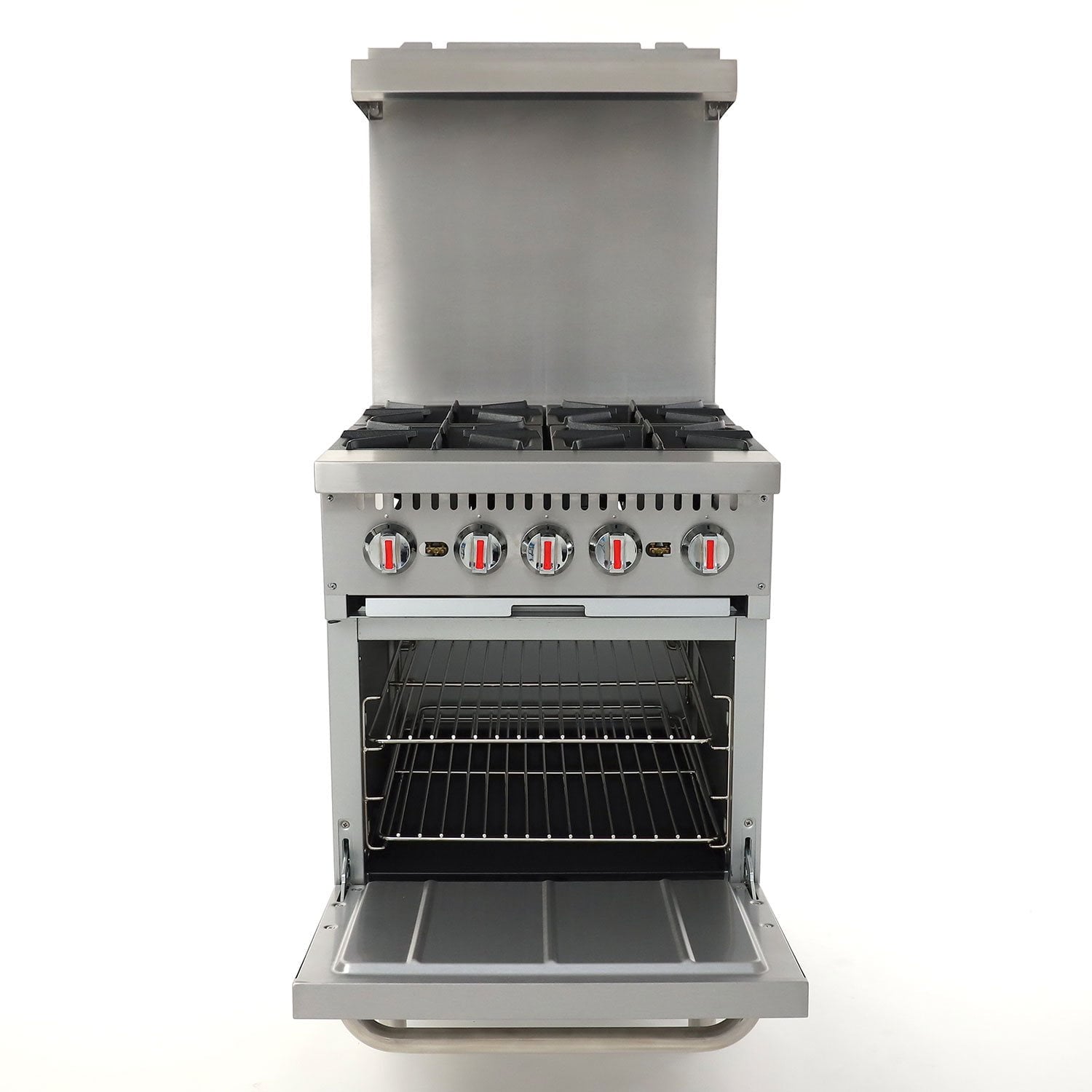 General gas ranges with oven are capable of handling an array of cookingPerfect for cooking up your favorite mealsStainless steel front, sides, back riser, lift-off high shelf6” stainless steel adjustable legs30,000 BTU/hr open top burners with lift-off headsManual pilot system (one pilot per two burners)12” x 12” cast iron open burner grates30,000 BTU/hr standard ovenOven thermostat adjusts from 250° to 500°FTwo oven racks (included) with four rack positionsWelded frame for heavy duty usagePull out Crumb Tray, accessible from the frontInsulated stainless steel oven doorStainless steel handle for oven doorAssembled Size24" (4 burners): 32.62" x 24" x 60.35", 278 lbs.36" (6 burners): 33.62" x 36" x 60.35", 369 lbs.