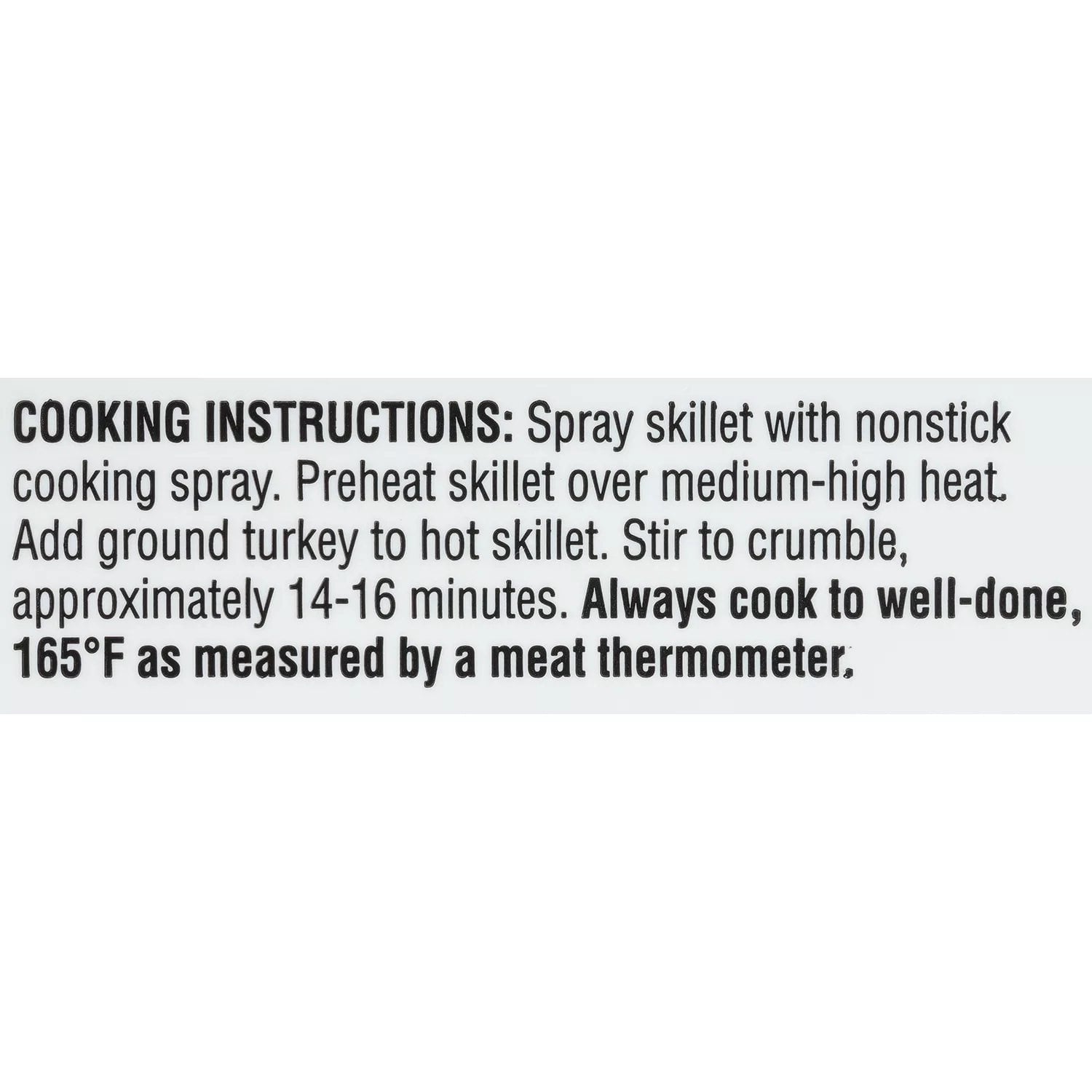 Skillet: Spray skillet with nonstick cooking spray. Preheat skilled over medium-high heat. Add ground turkey to hot skillet. Stir to crumble, approximately 14-16 minutes. Always cook to well-done, 165°F as measured by a meat thermometer.
