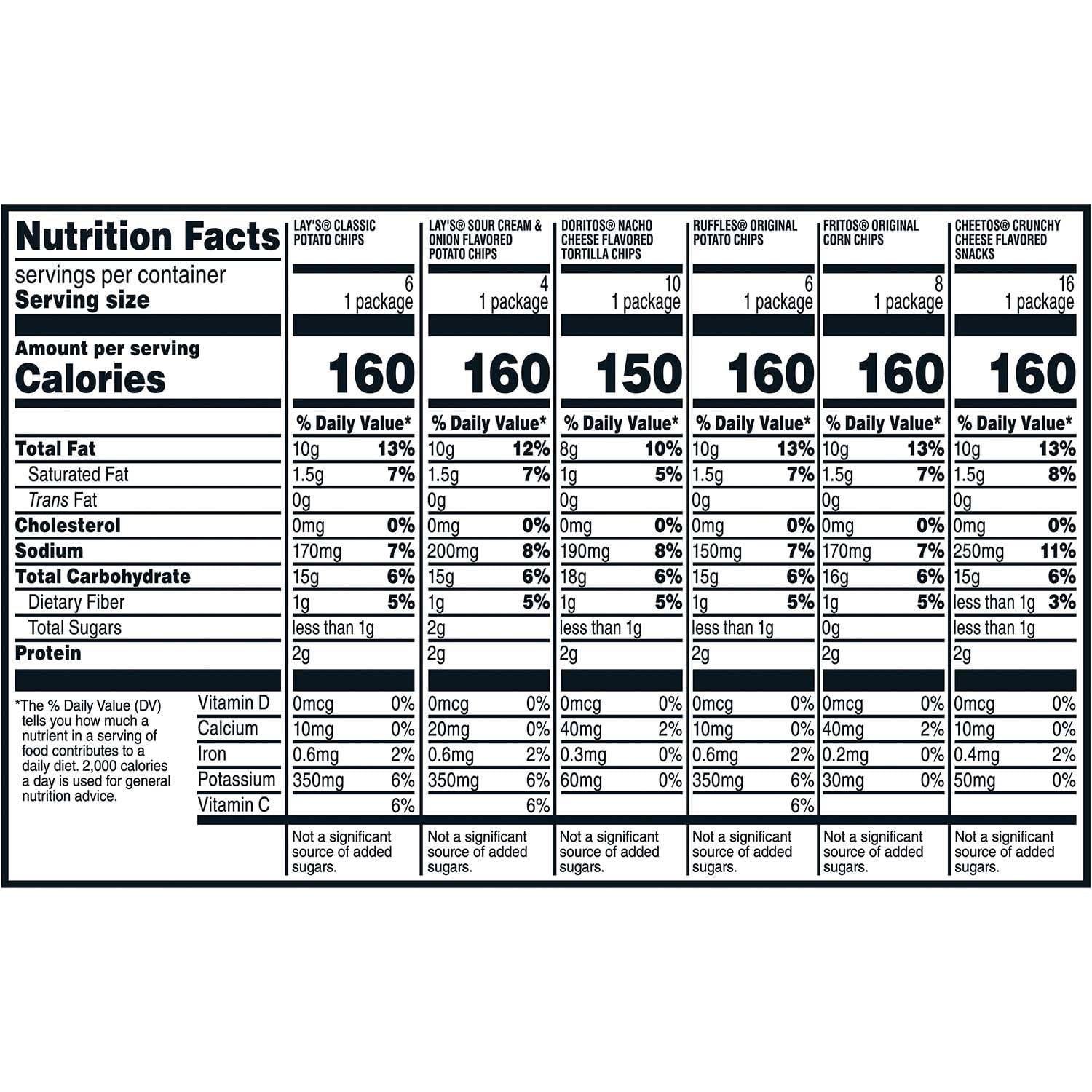 8 - Lay’s Classic Potato Chips10 - Doritos Nacho Cheese Flavored Tortilla Chips16 - Cheetos Crunchy Cheese Flavored Snacks8 - Fritos Original Corn Chips4 - Ruffles Original Potato Chips4 - Lay's Sour Cream & Onion Flavored Potato ChipsLay's Classic Potato Chip Ingredients: Potatoes, Vegetable Oil (Canola, Corn, Soybean, And/Or Sunflower Oil), And Salt.