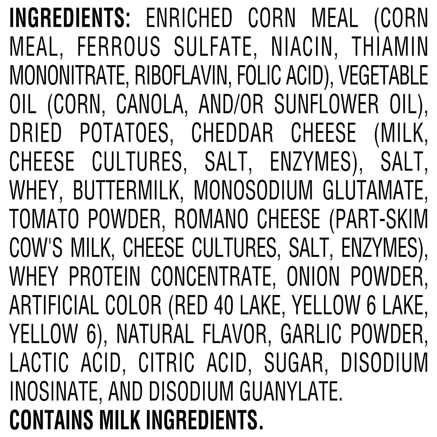 Ingredients: Enriched Corn Meal (Corn Meal, Ferrous Sulfate, Niacin, Thiamin Mononitrate, Riboflavin, Folic Acid), Vegetable Oil (Corn, Canola, And/Or Sunflower Oil), Salt, Whey, Maltodextrin (Made From Corn), Buttermilk, Monosodium Glutamate, Romano Cheese (Cow’s Milk, Cheese Cultures, Salt, Enzymes), Tomato Powder, Cheddar Cheese (Milk, Cheese Cultures, Salt, Enzymes), Onion Powder, Artificial Color (Red 40 Lake, Yellow 6 Lake, Yellow 6), Natural Flavors, Garlic Powder, Sodium Caseinate, Lactose, Lactic Acid, Citric Acid, Sugar, Skim Milk, Whey Protein Concentrate, Disodium Inosinate, And Disodium Guanylate.