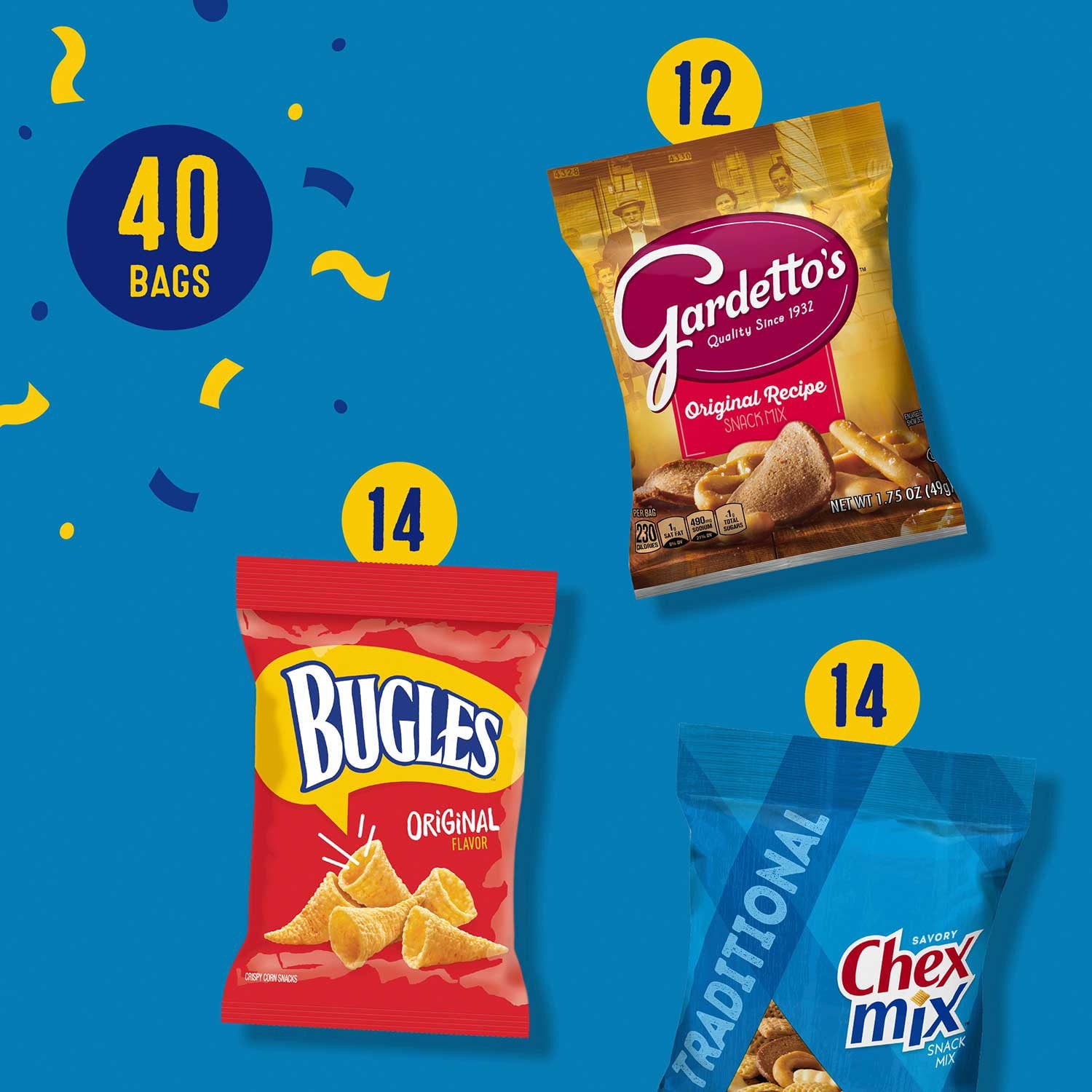 This variety pack contains a total of 40 snack bags: 12 Gardetto's, 14 Bugles Original, and 14 Chex Mix Traditional. Convenience is the name of the game with Chex mix individual packs, Gardetto's snack mix individual packs, and Bugles individual packs. These snack mix packs are great party favors and fit perfectly in school lunches.