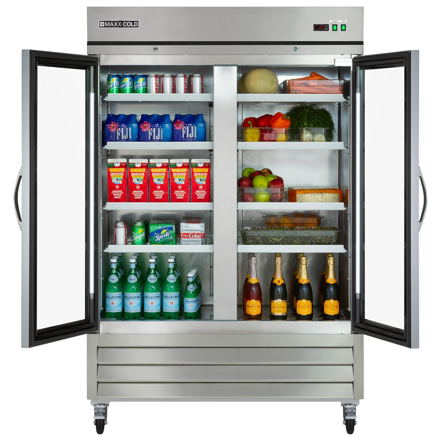 Maxx Cold 53.9" wide double glass door, top mount reach-in refrigerator combines durability and longevity with visual appeal. Featuring an energy efficient bottom mounted compressor, this glass two-door refrigerator effectively displays foodservice products at the ideal temperature to preserve freshness and extend shelf life. The cabinet is equipped with 6 heavy-duty fully adjustable and easy to clean PE coated wire shelves which can hold full size sheet pans and provides up to 49 cubic ft. (1387 L) of storage capacity, while it’s slender and solid build makes it a great choice for limited spaces. In addition, the two self-closing, locking, dual-pane glass doors of this commercial refrigerator are engineered with an open-door alert that beeps if the refrigerator is left open for three minutes. This environment friendly reach-in commercial grade refrigerator is constructed of durable stainless-steel. The unit is mounted on 4” diameter swivel caster wheels that can easily be maneuvered. Standard features on this premium indoor refrigerator include integrated energy saving interior LED lighting, automatic defrost function, lock and key set for security and digital temperature control which maintains optimum temperature. Digital temperature display can be viewed from outside the cabinet, which is engineered with an integrated condensate evaporator; meaning no drain line connection is needed. The urethane foam insulation on this two-door commercial refrigerator provides outstanding thermal regulation and is energy efficient.