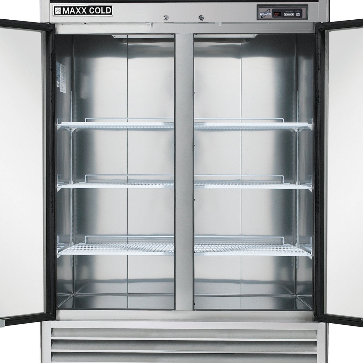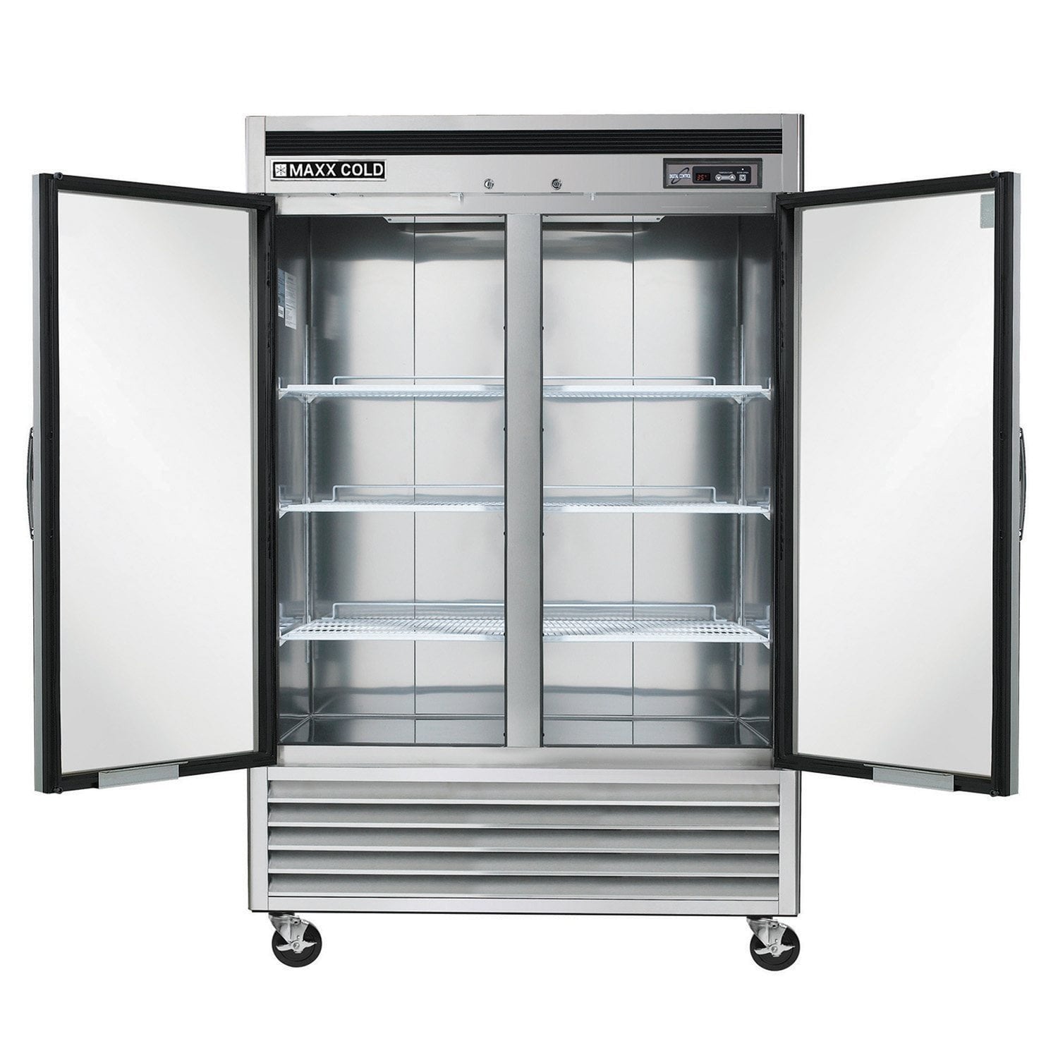 This commercial-grade refrigerator is a necessity for any commercial kitchen, designed to meet all food service industry requirements. Its large storage capacity of up to 49 cubic ft. (1,387 L) is supported by six heavy-duty, fully adjustable, and easy-to-clean PE-coated wire shelves that can accommodate full-size sheet pans. The refrigerator also features recessed handles with door locks and self-closing doors that stay open past 90 degrees, making it an excellent fit for limited spaces.