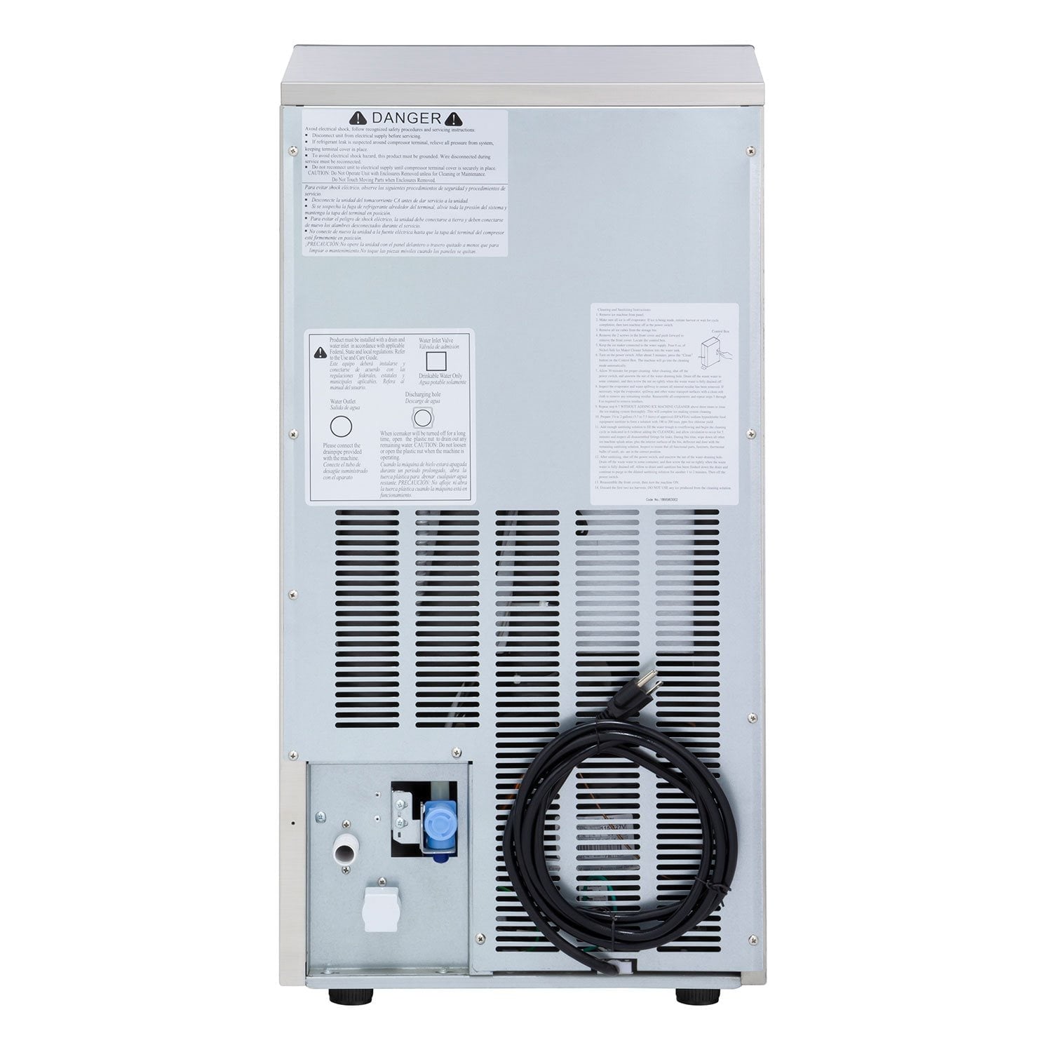 Ice maker has a polyethylene interior liner with ice storage capacity of 25 lbs (11 kg)Exterior is constructed of stainless steel and black trim that is easy to cleanFront breathing air-cooled design is energy efficientProgrammable, solid state, digital electronic control system are intuitiveBuilt-in self cleaning mode assist with maintenance3/4 inch gravity drain is requiredIce machine is available in 115V/60Hz and upon request 220V/50-60HzSupplied with ice scoop and 6 foot 5-15P NEMA cord set