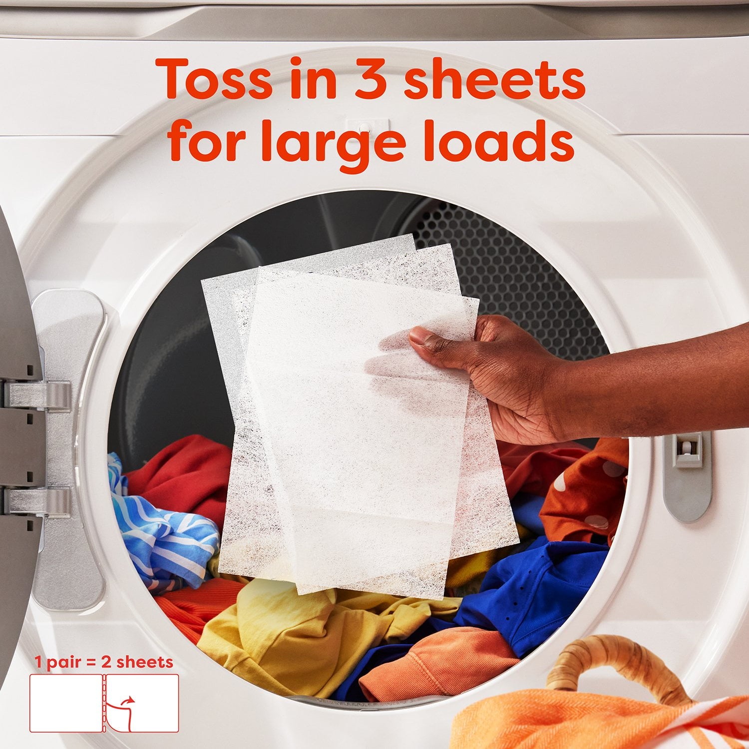 | Use Instructions | Add a new sheet on top of clothes at start of drying. Discard after each dryer cycle. For Best Results: For large loads, use an extra sheet. Use low heat setting for synthetics. If spotting occurs at high heat setting, rub spot with a bar soap and rewash in warm water. |