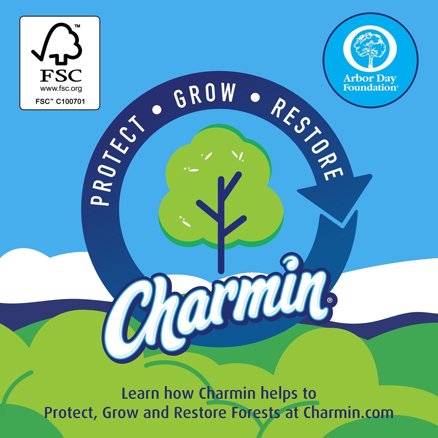 At Charmin, we are committed to making our toilet paper work hard to make a sustainable difference. 100% of our paper comes from responsibly managed forests. For every tree used, at least two are regrown in its place. P&G and Charmin are partnering with the Arbor Day Foundation to plant 1 million trees in forests affected by natural disasters, like wildfires or hurricanes