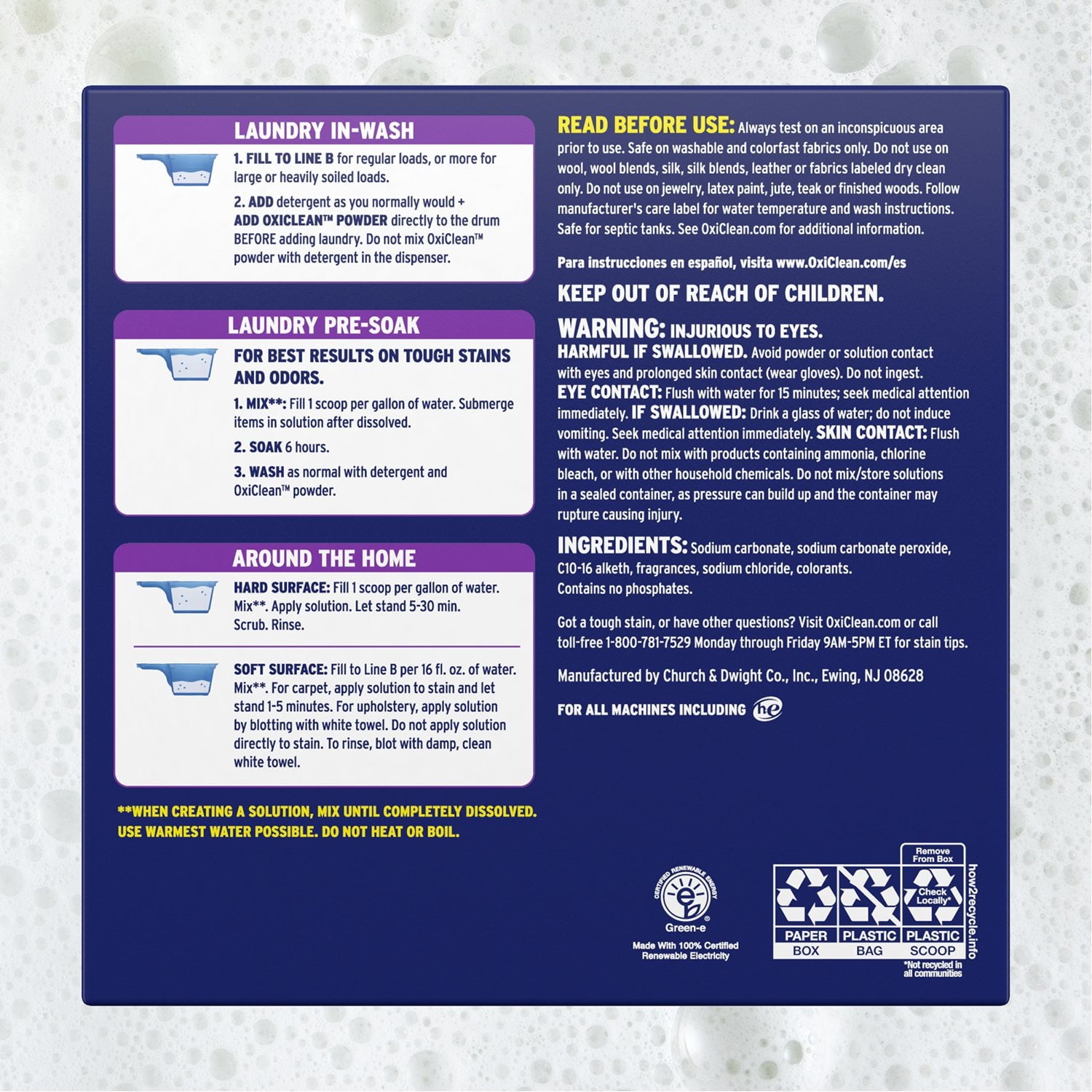 Use Instructions In Wash: Fill to Line B for regular loads, or more for large or heavily soiled loads. Add detergent as you normally would & add OxiClean Powder directly to the drum before adding laundry. Do not mix OxiClean powder with detergent in the dispenser. Read your HE owner’s manual for instructions. Soaking Instructions: Mix: Fill 1 scoop per gallon of water. Submerge items in solution after dissolved. Soak: 6 hours. Wash: As normal with detergent and OxiClean powder. Around the Home: Hard Surface: Fill 1 scoop per gallon of water. Mix**. Apply solution. Let stand 5-30 minutes. Scrub. Rinse. Soft Surface: Fill to Line B per 16fl. oz. of water. Mix**. For carpet, apply solution to stain and let stand 1-5 minutes. For upholstery, apply solution by blotting with white towel. Do not apply solution directly to stain. To rinse, blot with damp, clean white towel. **when creating a solution, mix until completely dissolved. Use warmest water possible. Do not heat or boil.