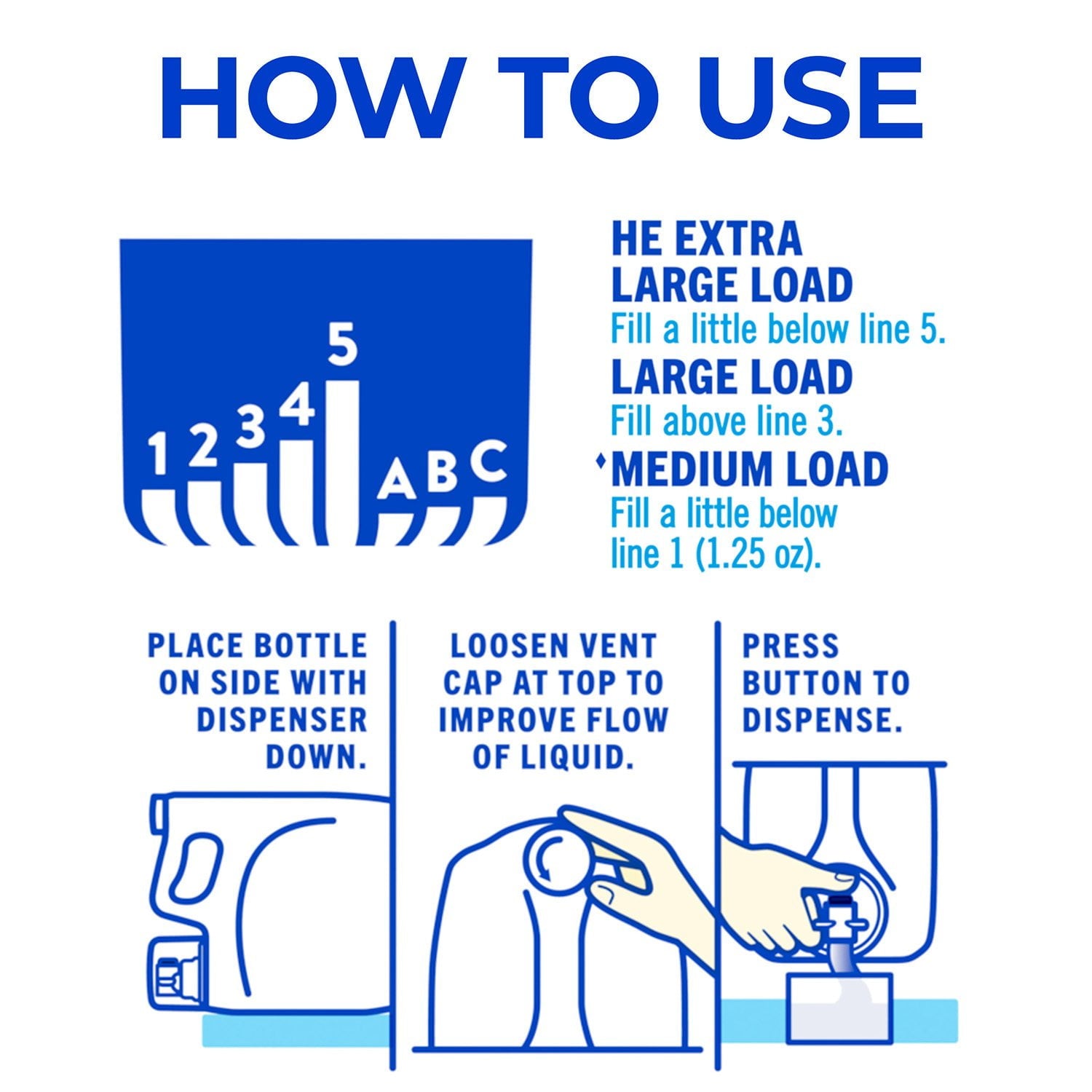 Use Instructions Directions: REGULAR LOAD: Fill a little below line 1 (1.25oz), LARGE LOAD: Fill above line 3 & XL FULL LOAD: Fill a little below line 5. Pre-Treating: Rub a small amount directly onto the stain before washing. Check an inseam for colorfastness.Septic Safe: YesColor Safe: YesHE Compatible: Yes